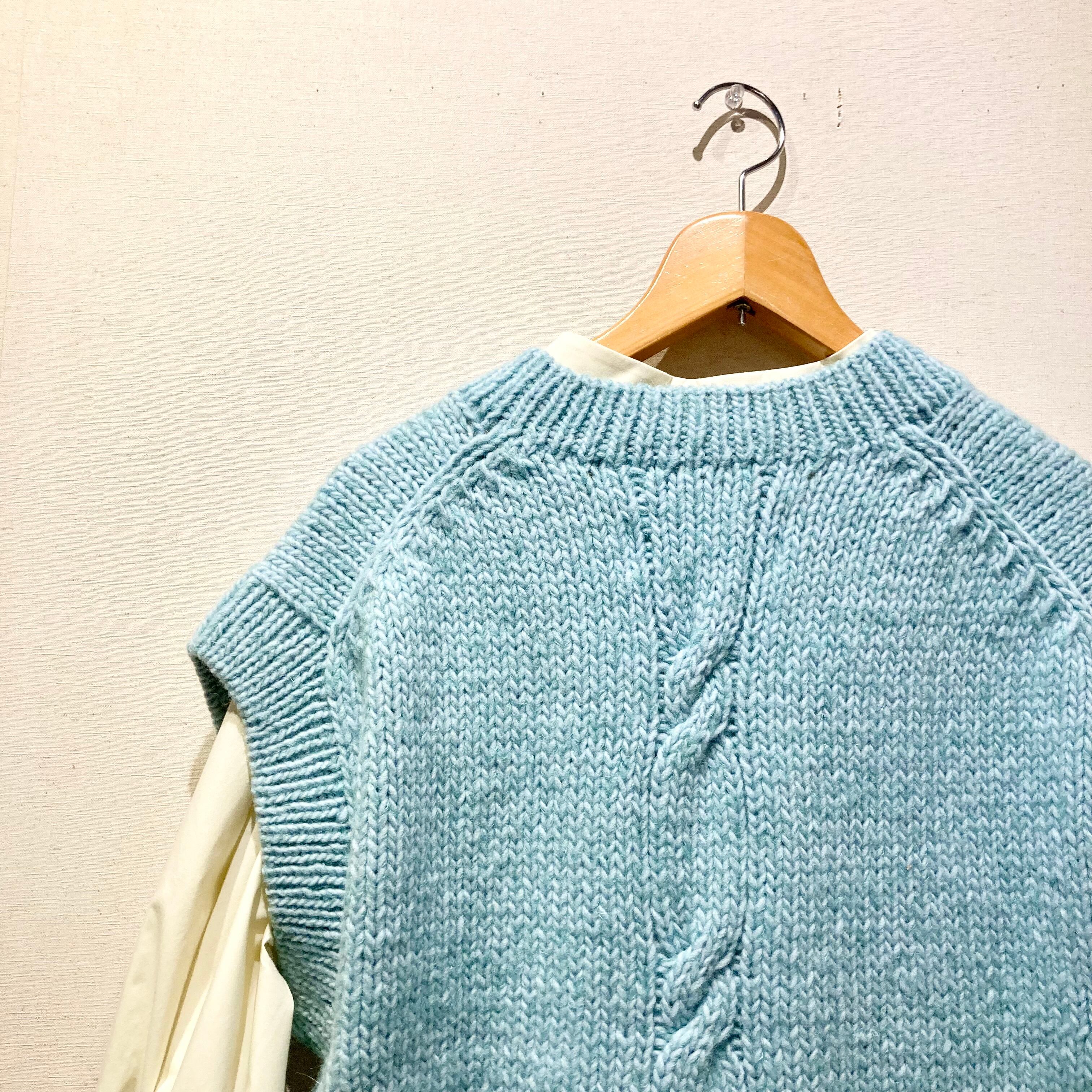 デザインは前身頃と後ろ身頃中央にケーブル編みが入ったシンプルなVネックのベストです