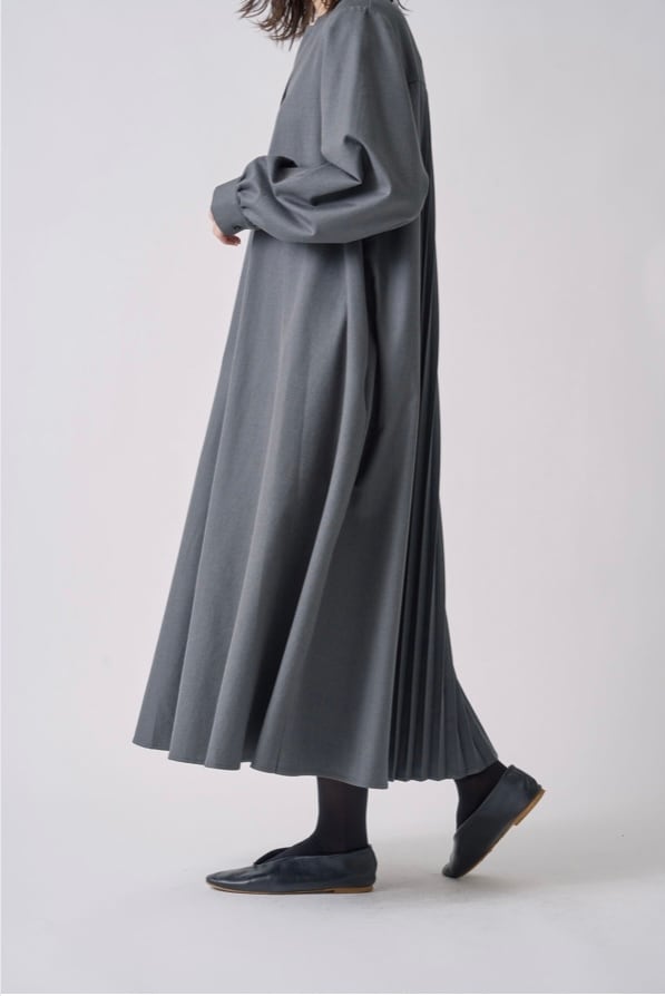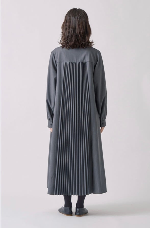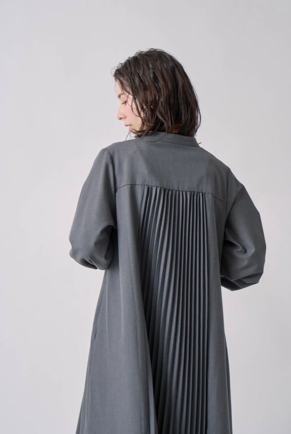 ラペルの様なカッティングを施した襟デザインと後ろ身頃のプリーツデザインが
