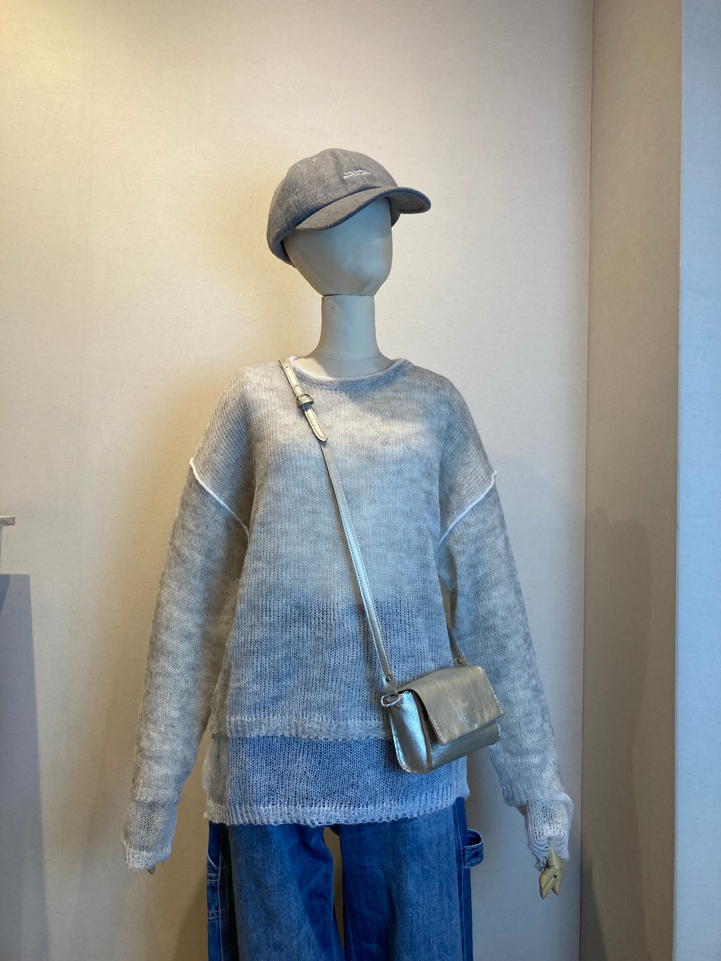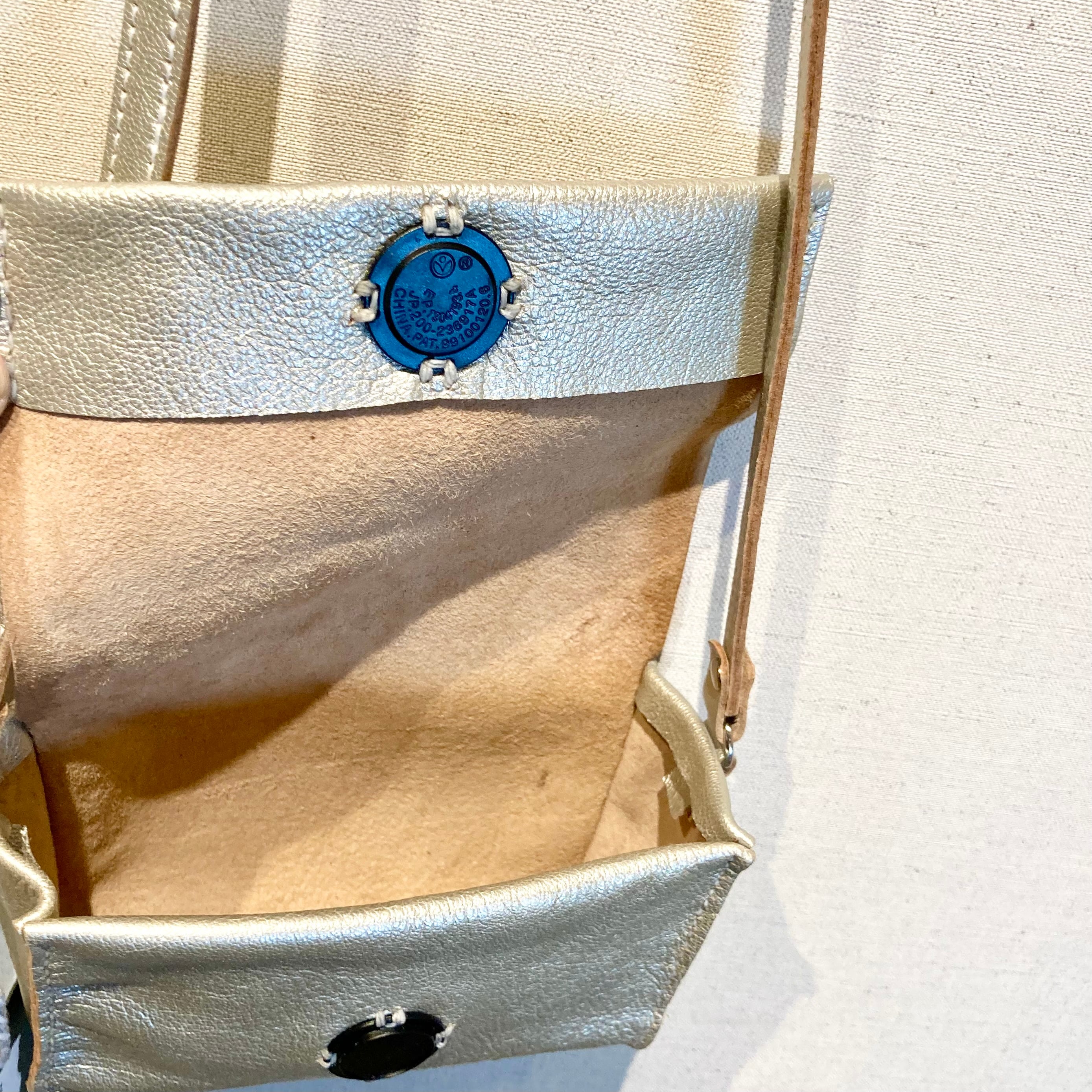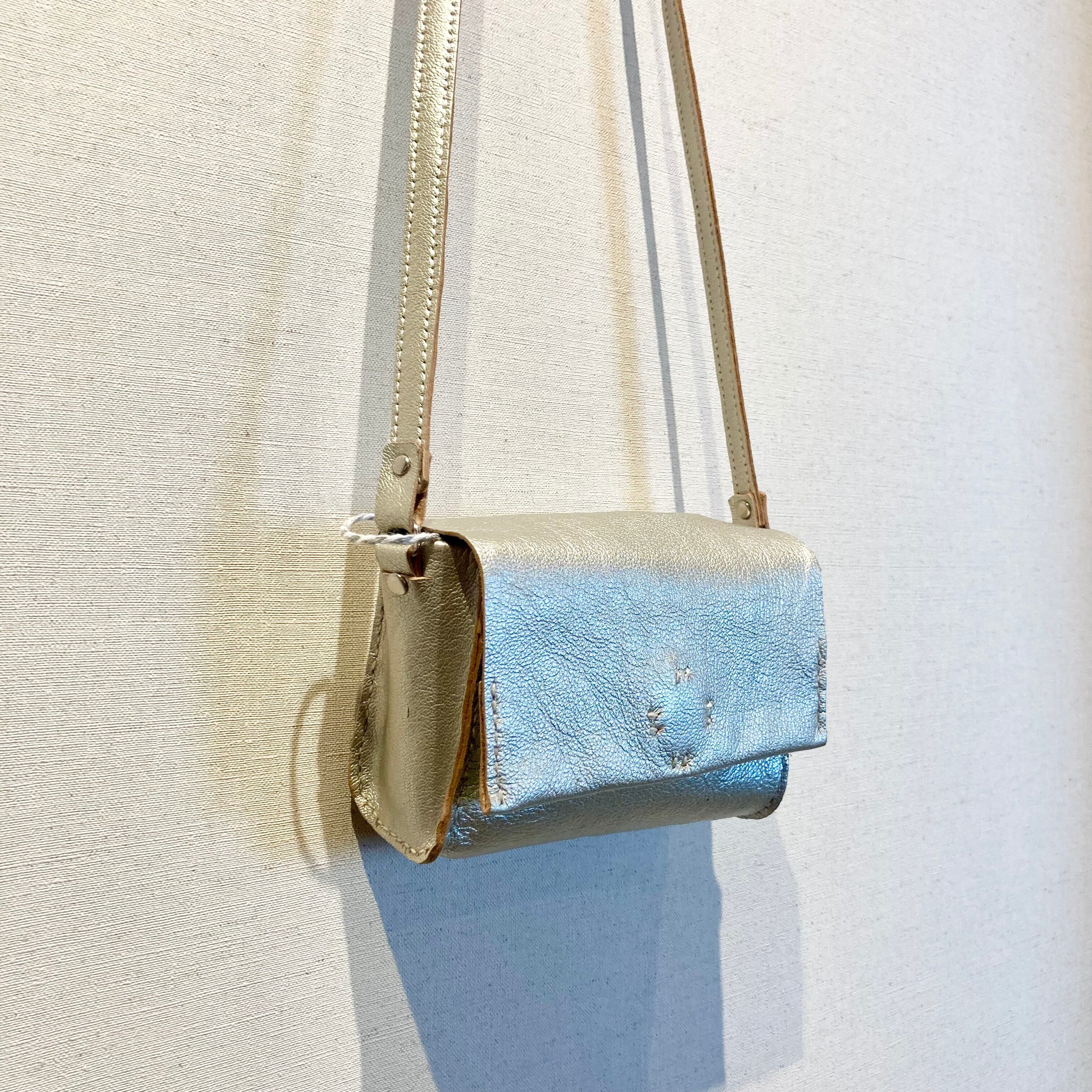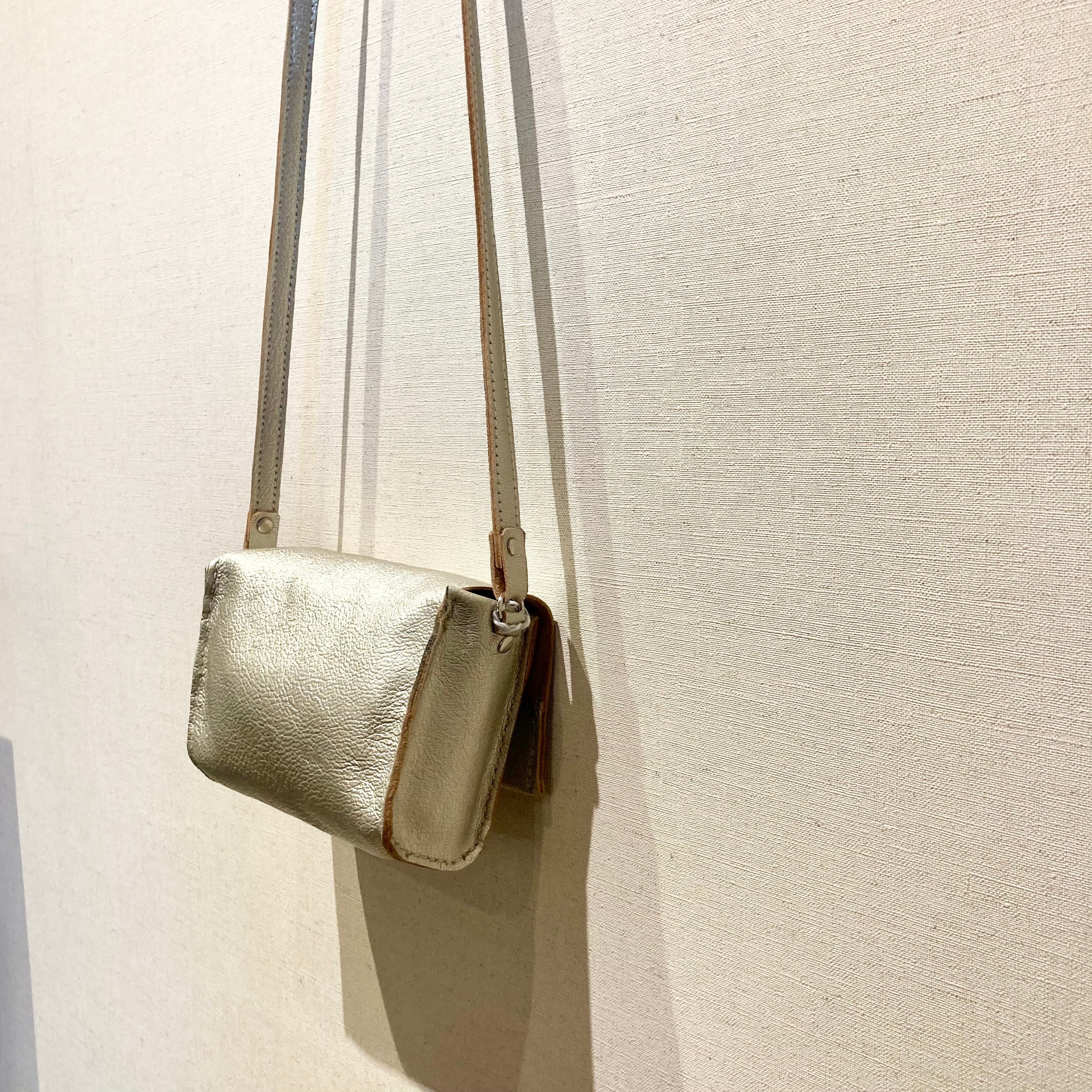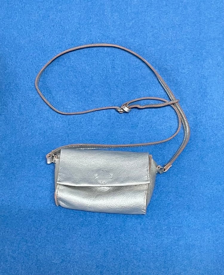 シャンパンシルバー色の箔加工山羊革を使用したミニポシェットです