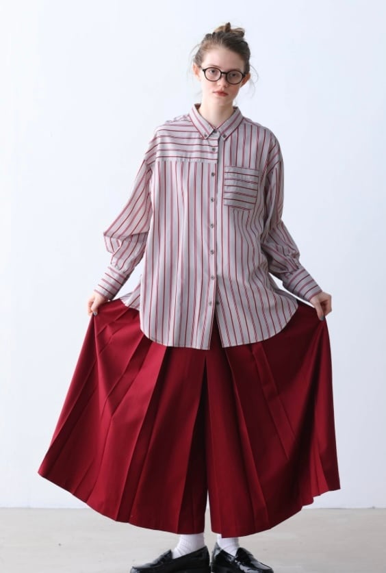 タックプリーツが入った袴風のデザインパンツ…プリーツのひだが取れにくい微光沢のTR素材でスカート見えするパンツです