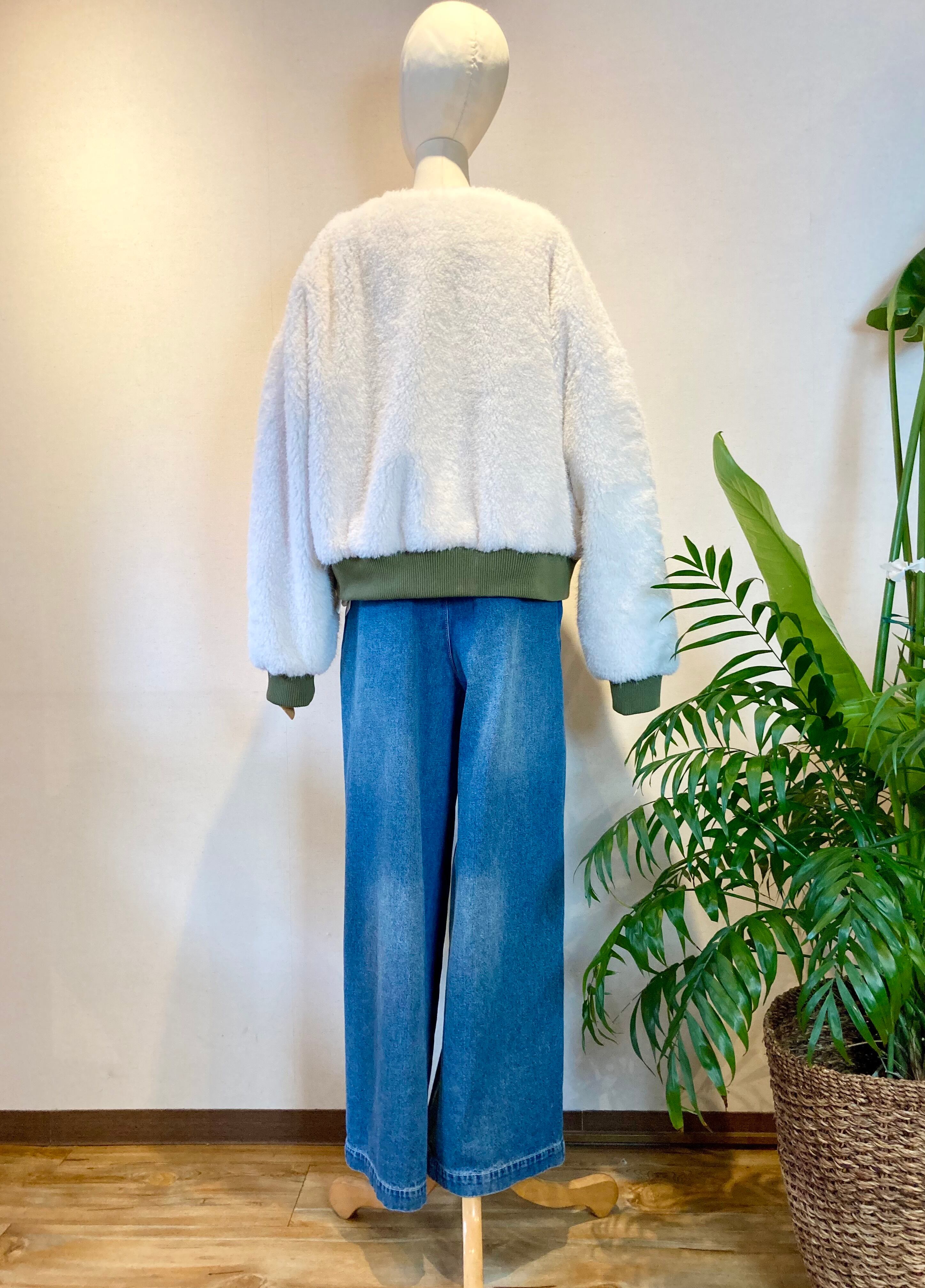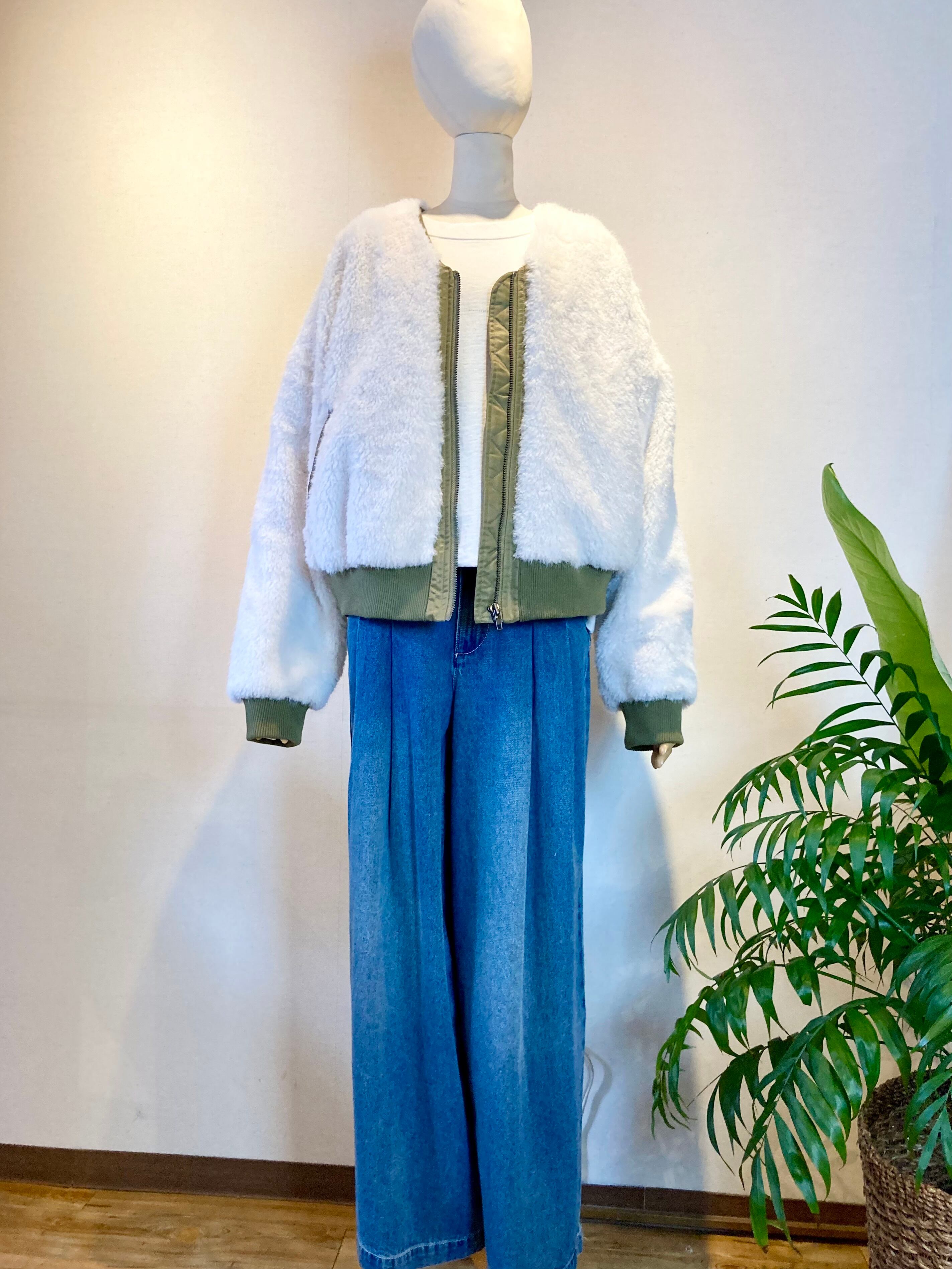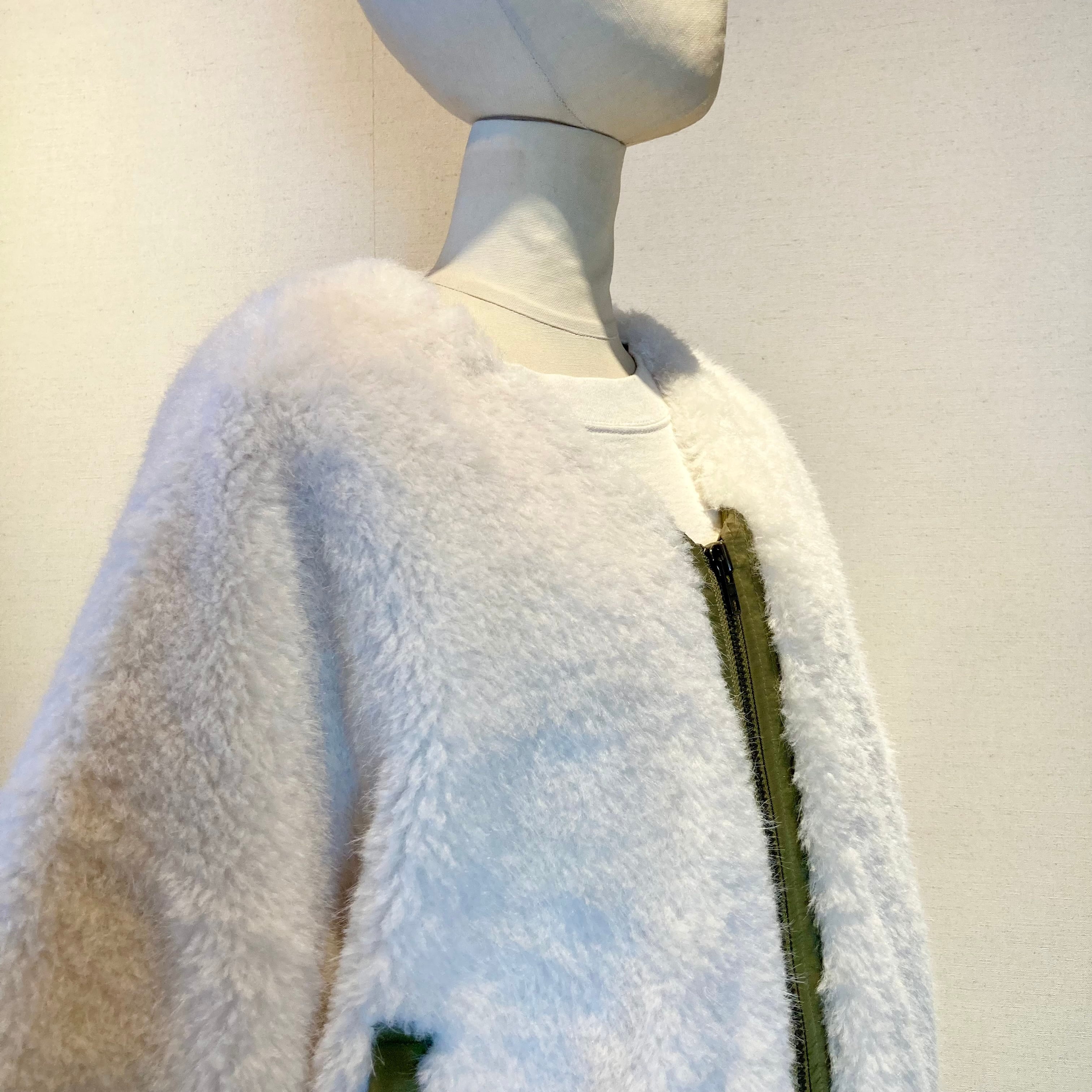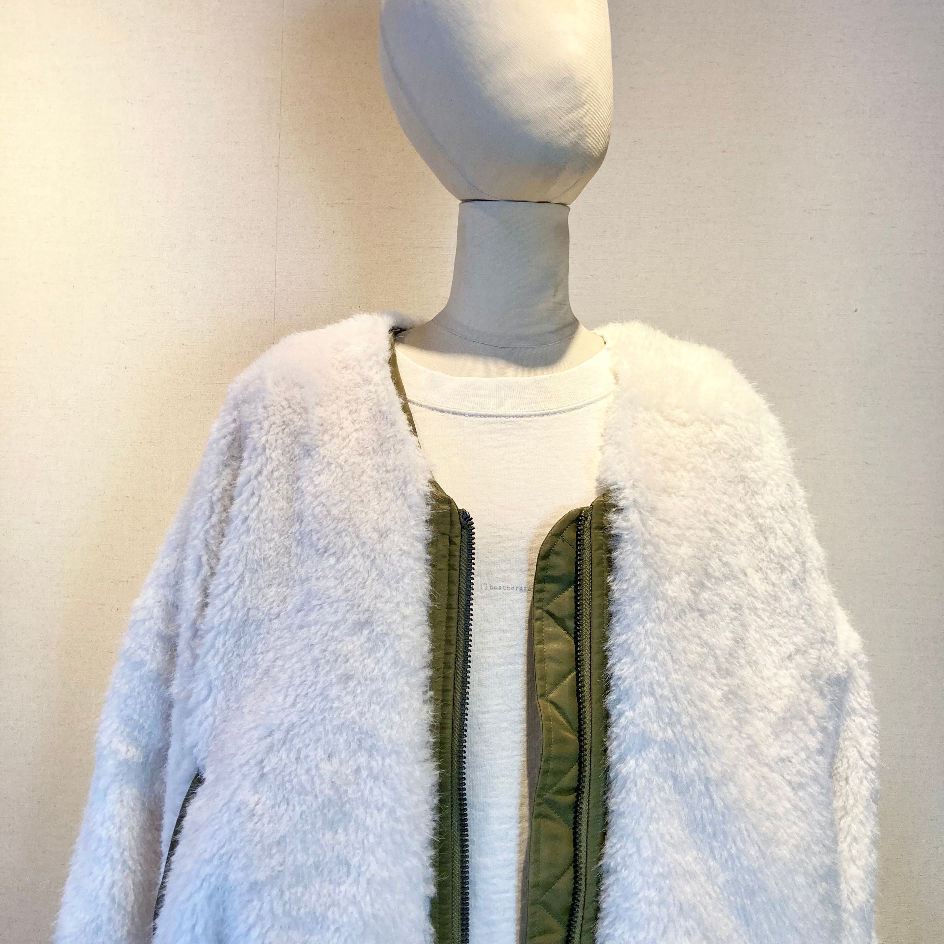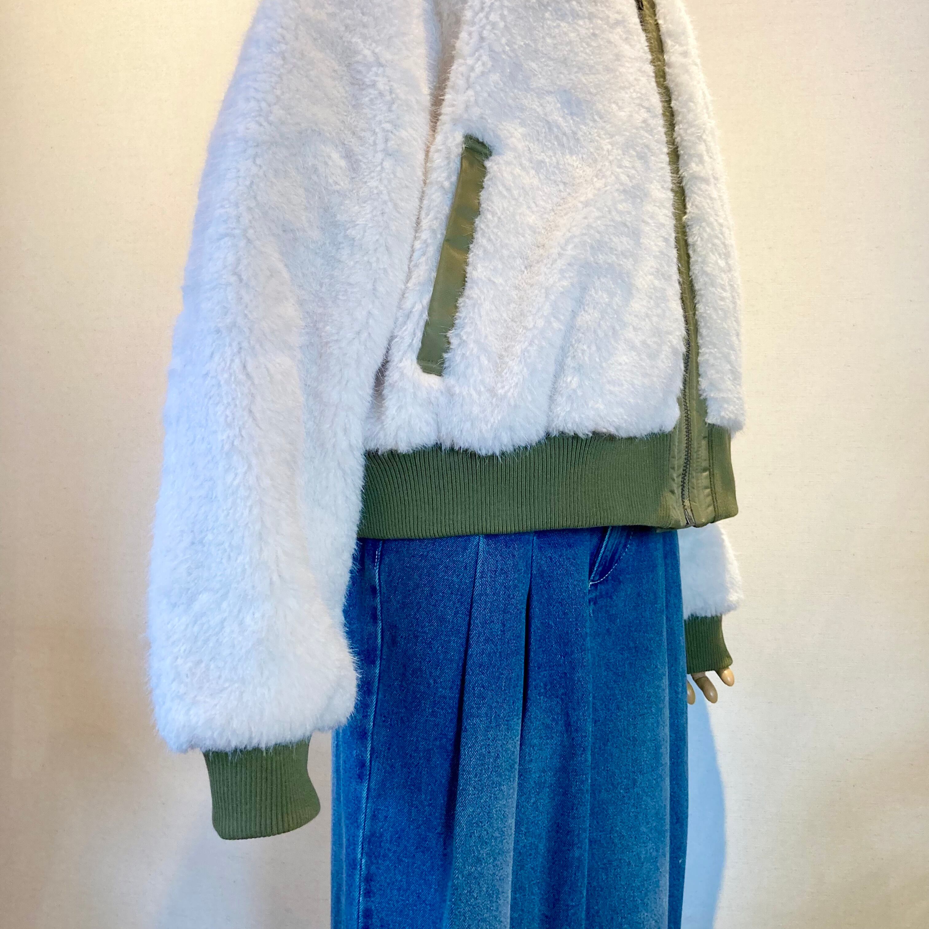 ボディにはフェイクファー素材、前立てやポケット口はナイロン素材を使用したショート丈ブルゾン…