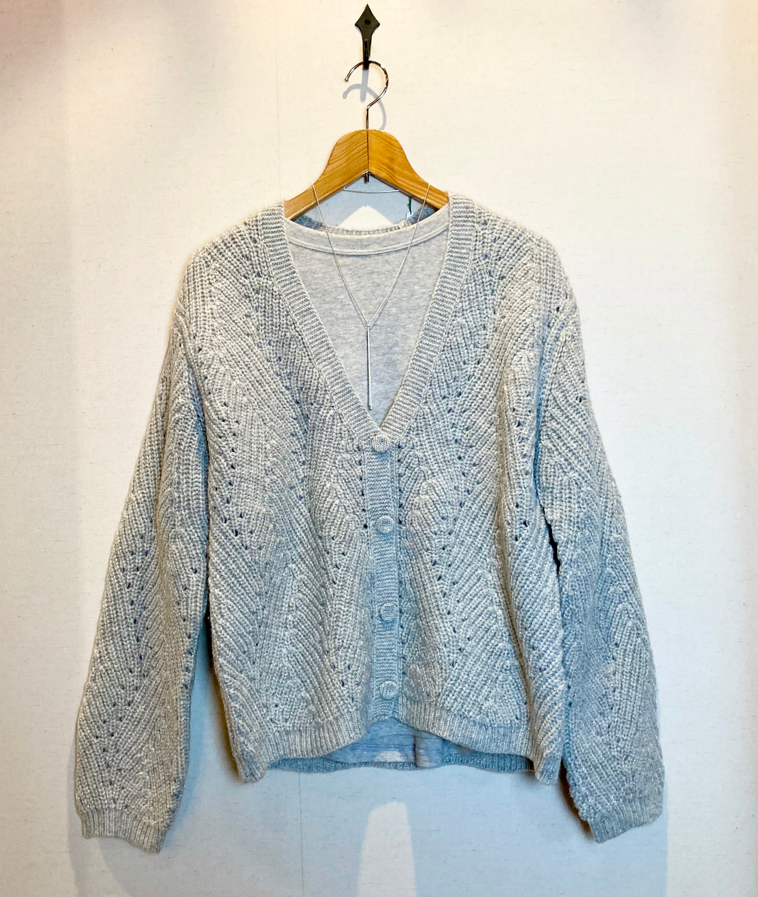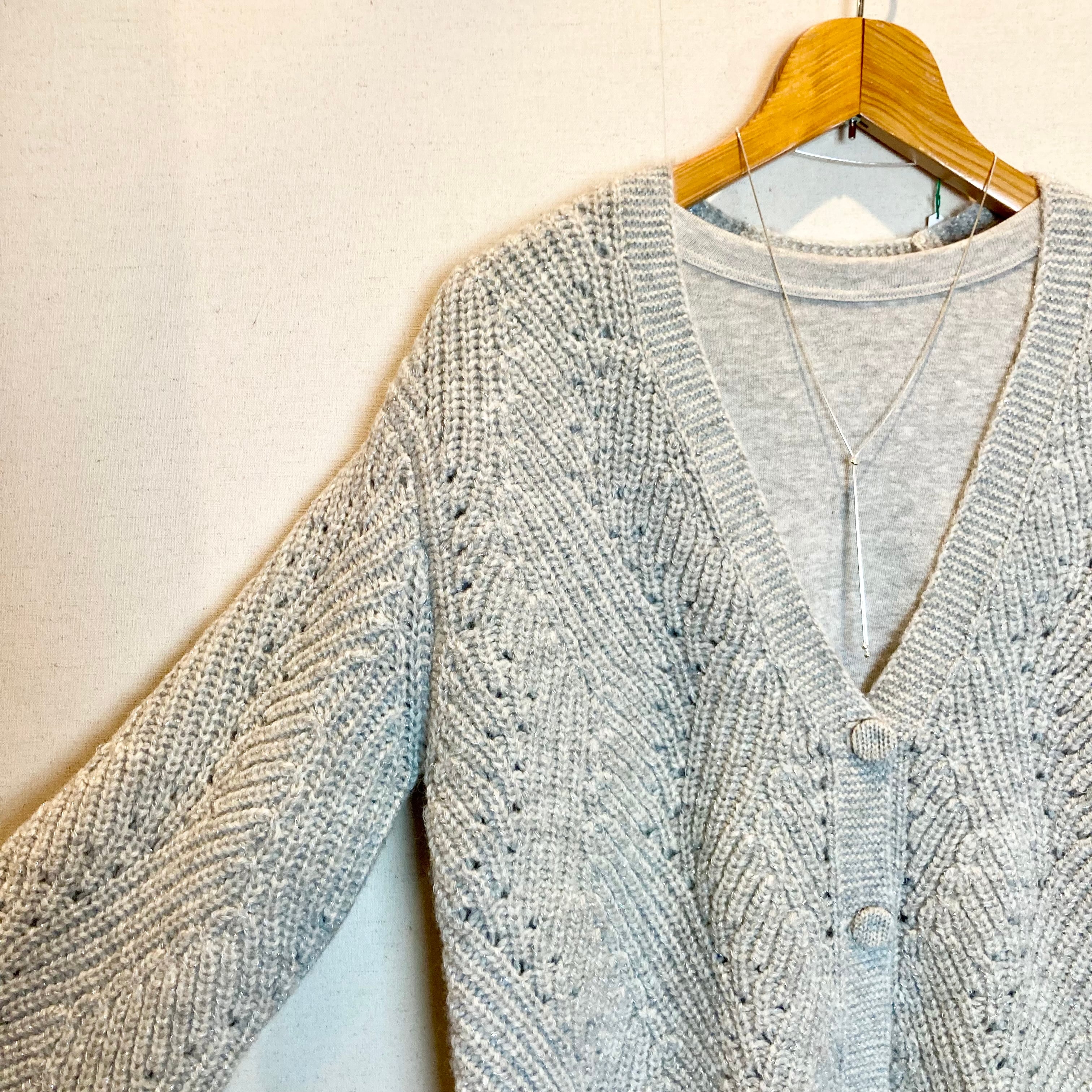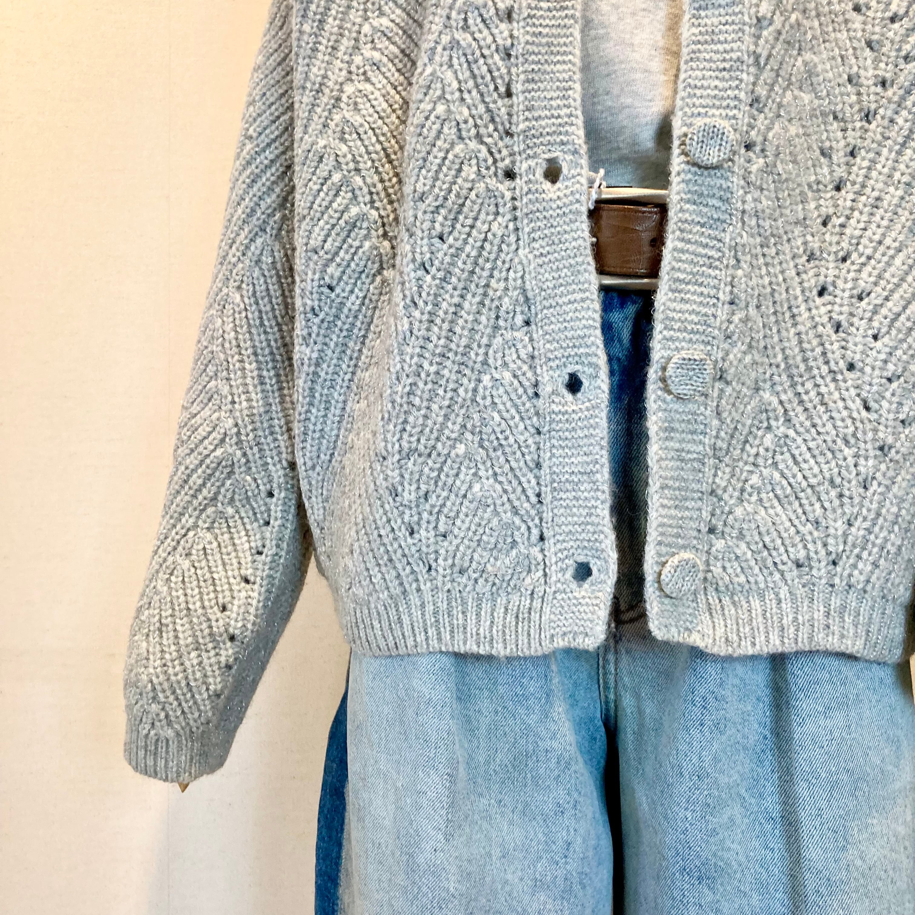 ざっくりと編み込まれたVネックのニットカーディガン…