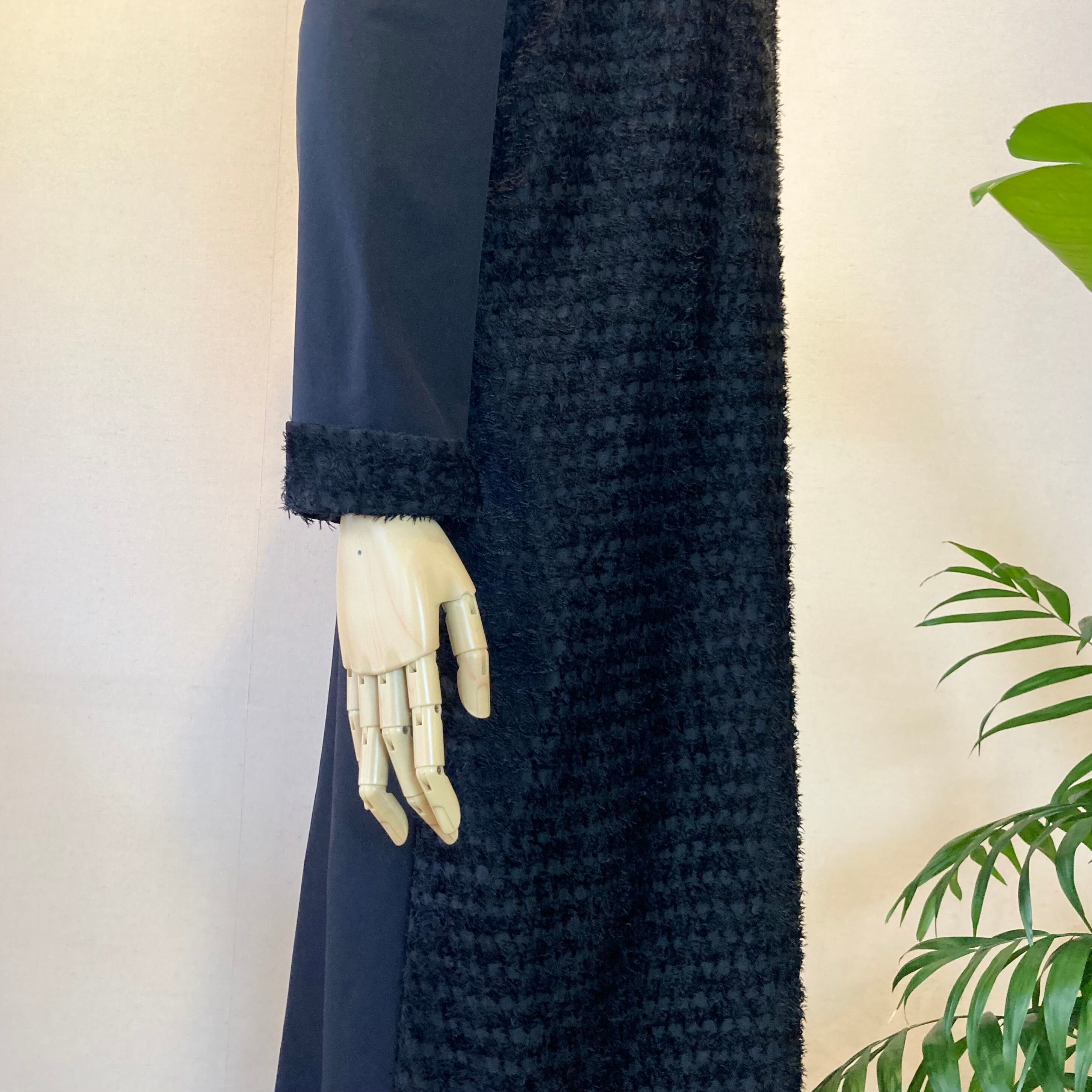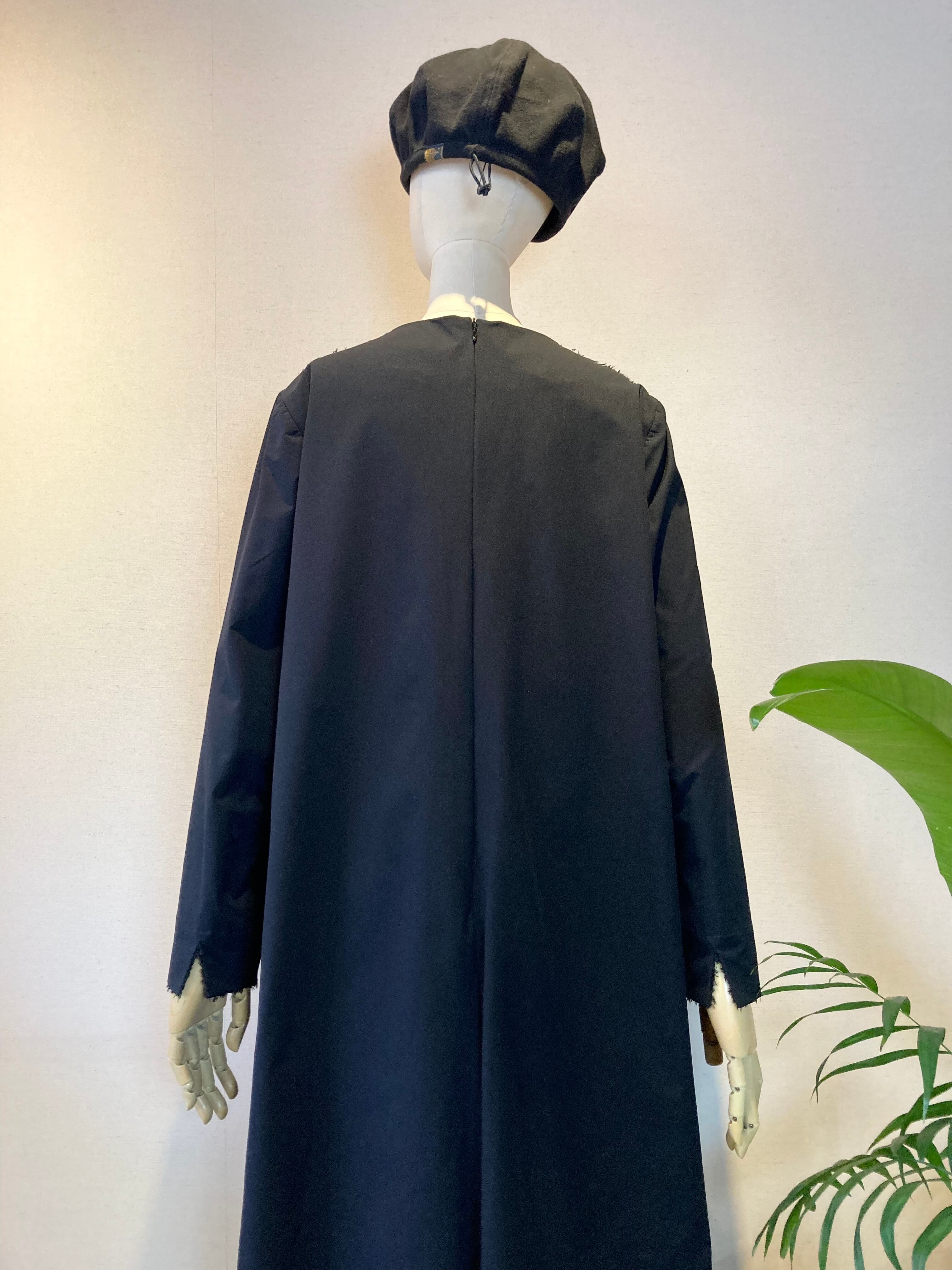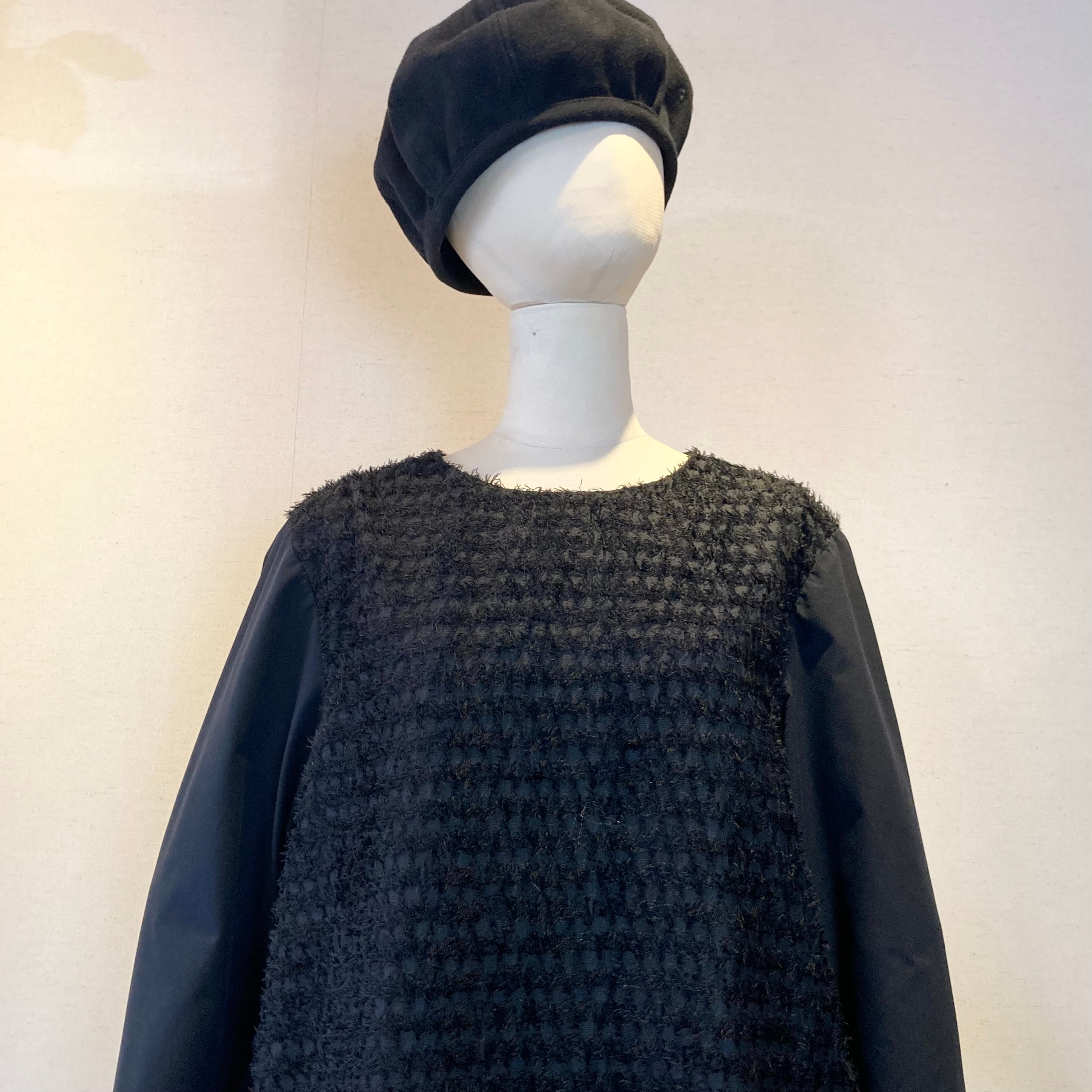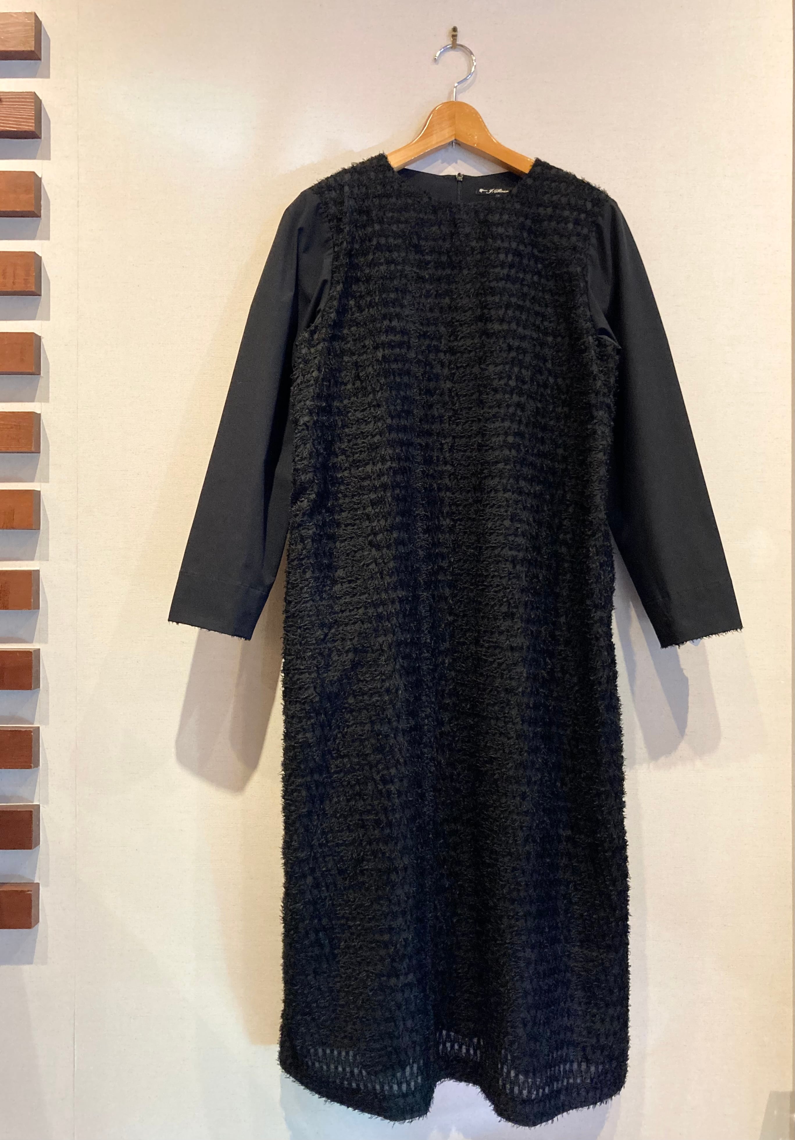 前身頃と袖口見返しをジャガード生地で切り替えたシンプルなAラインのワンピース…