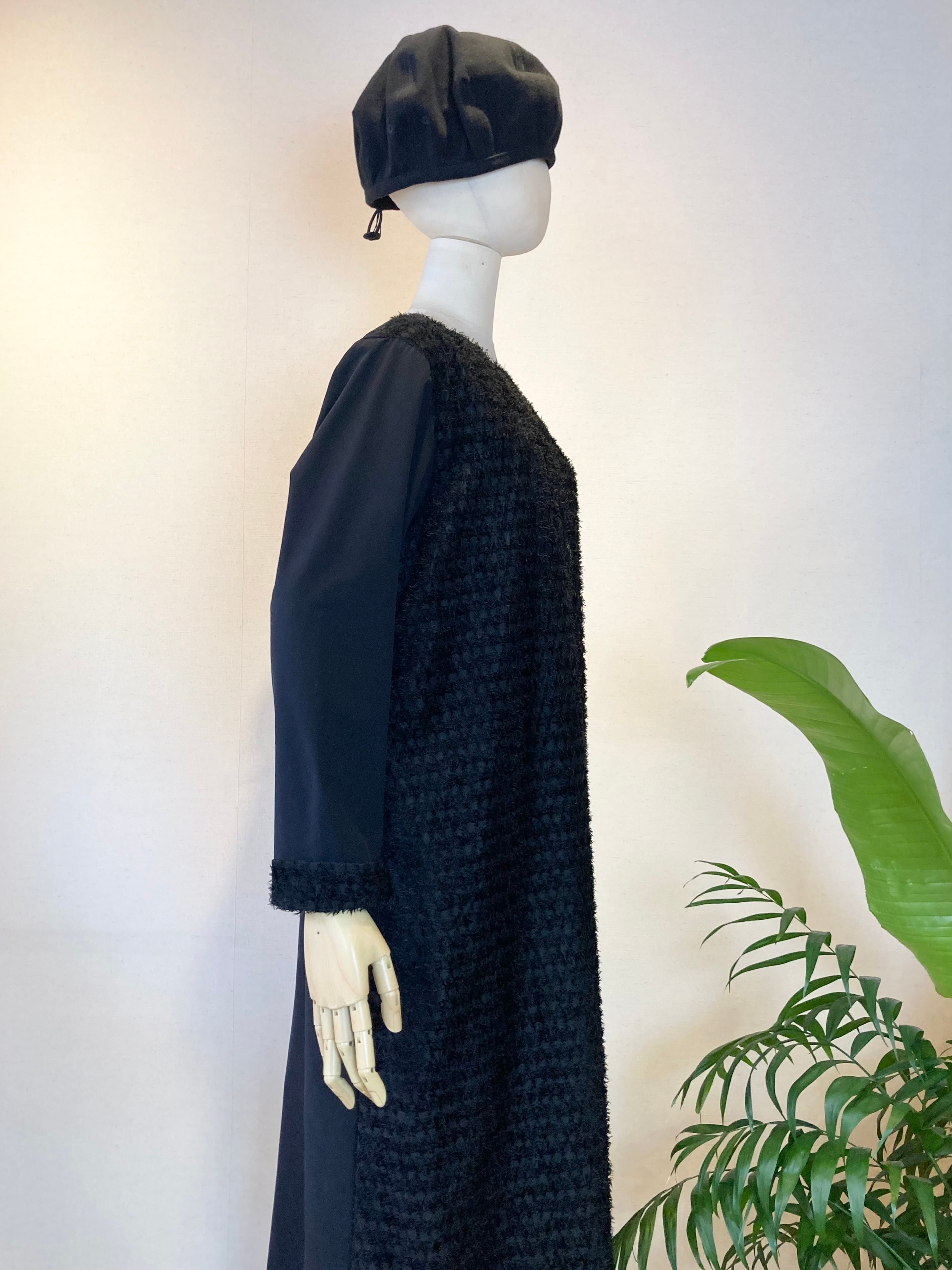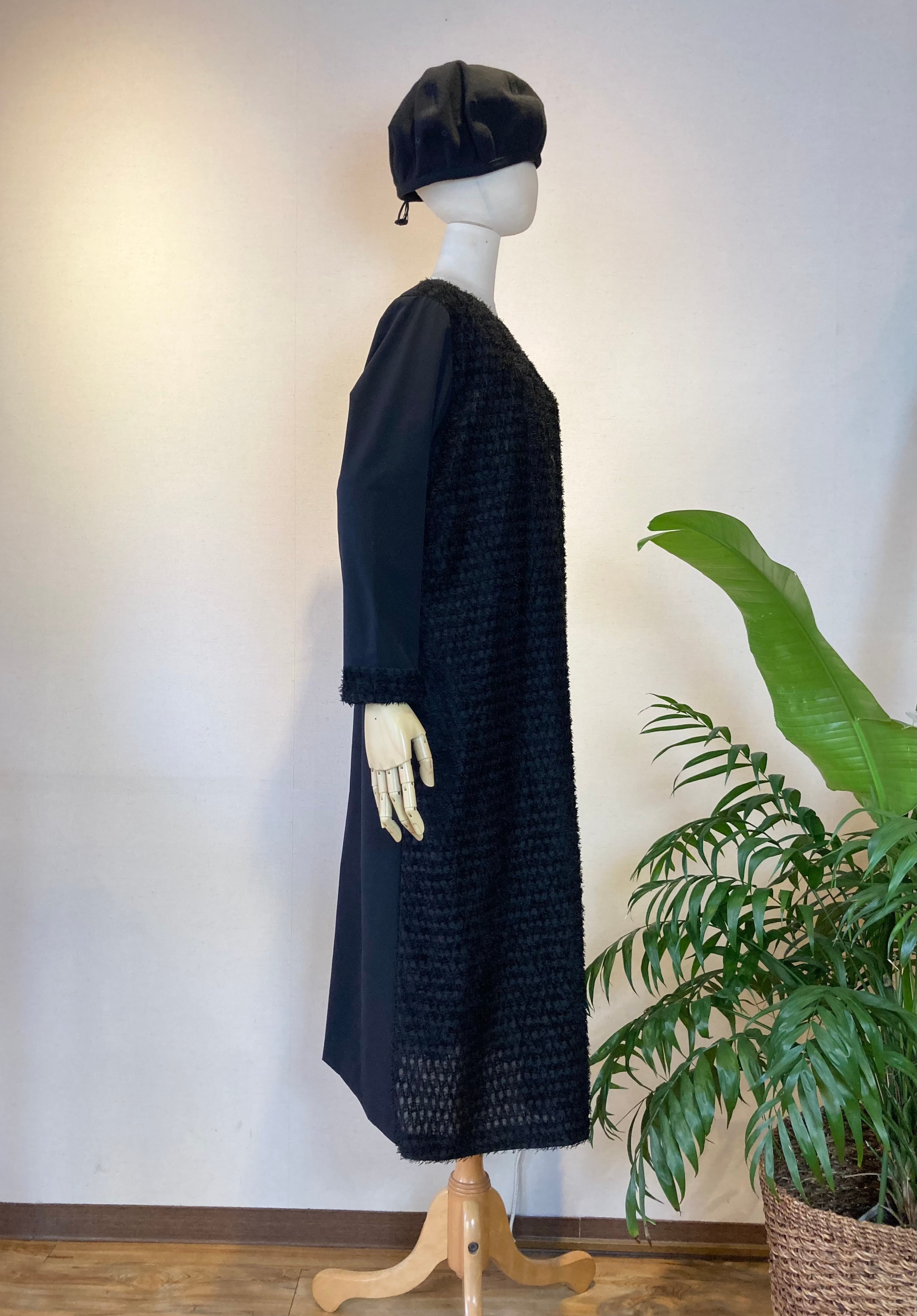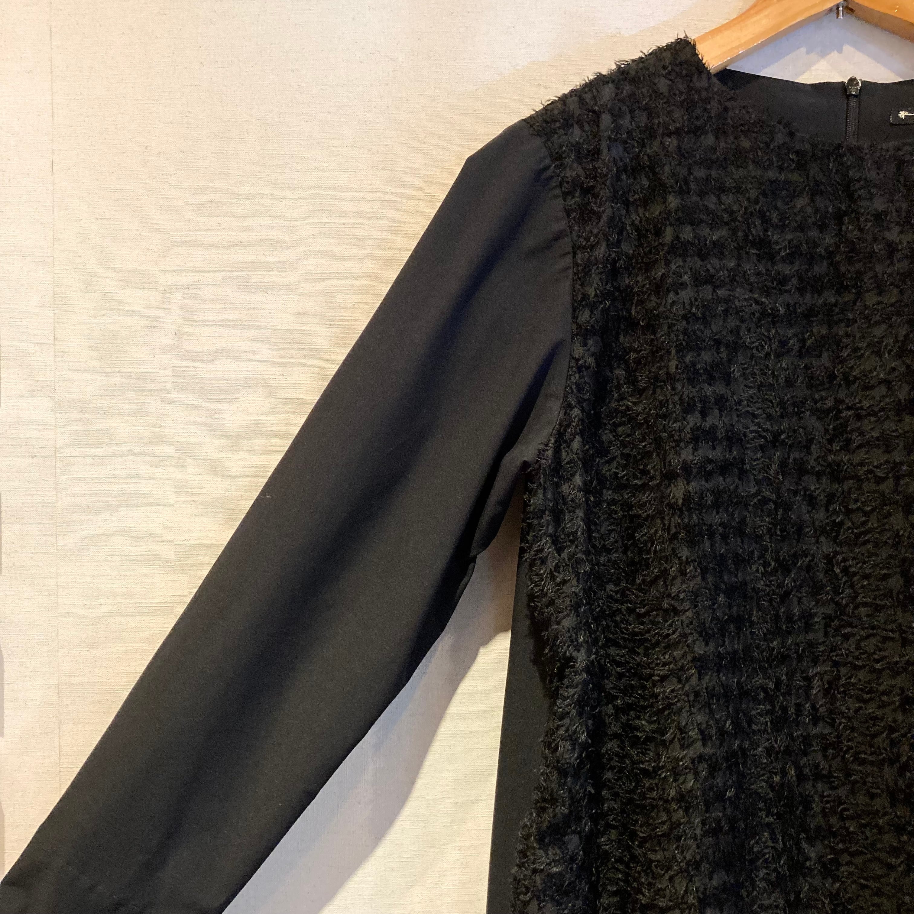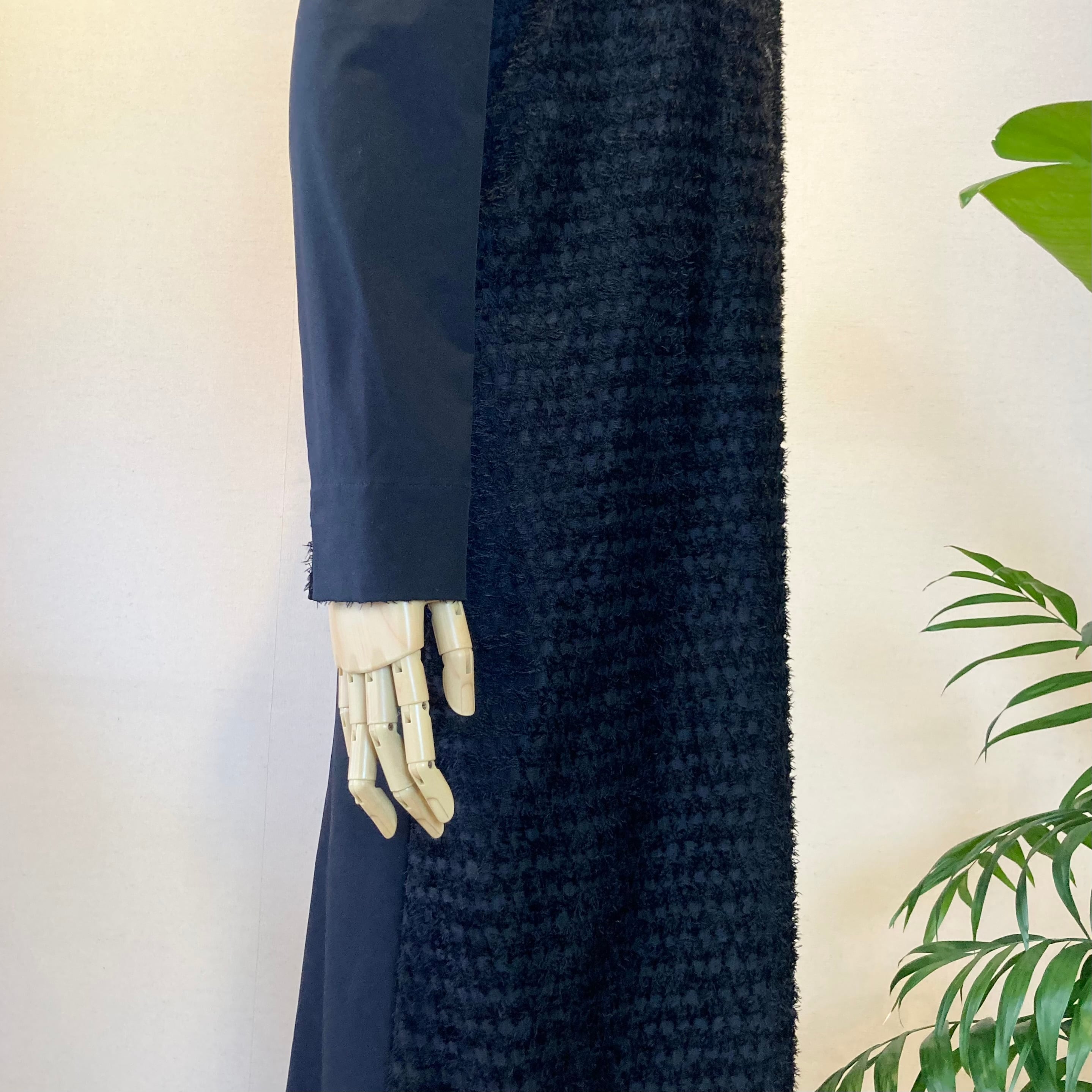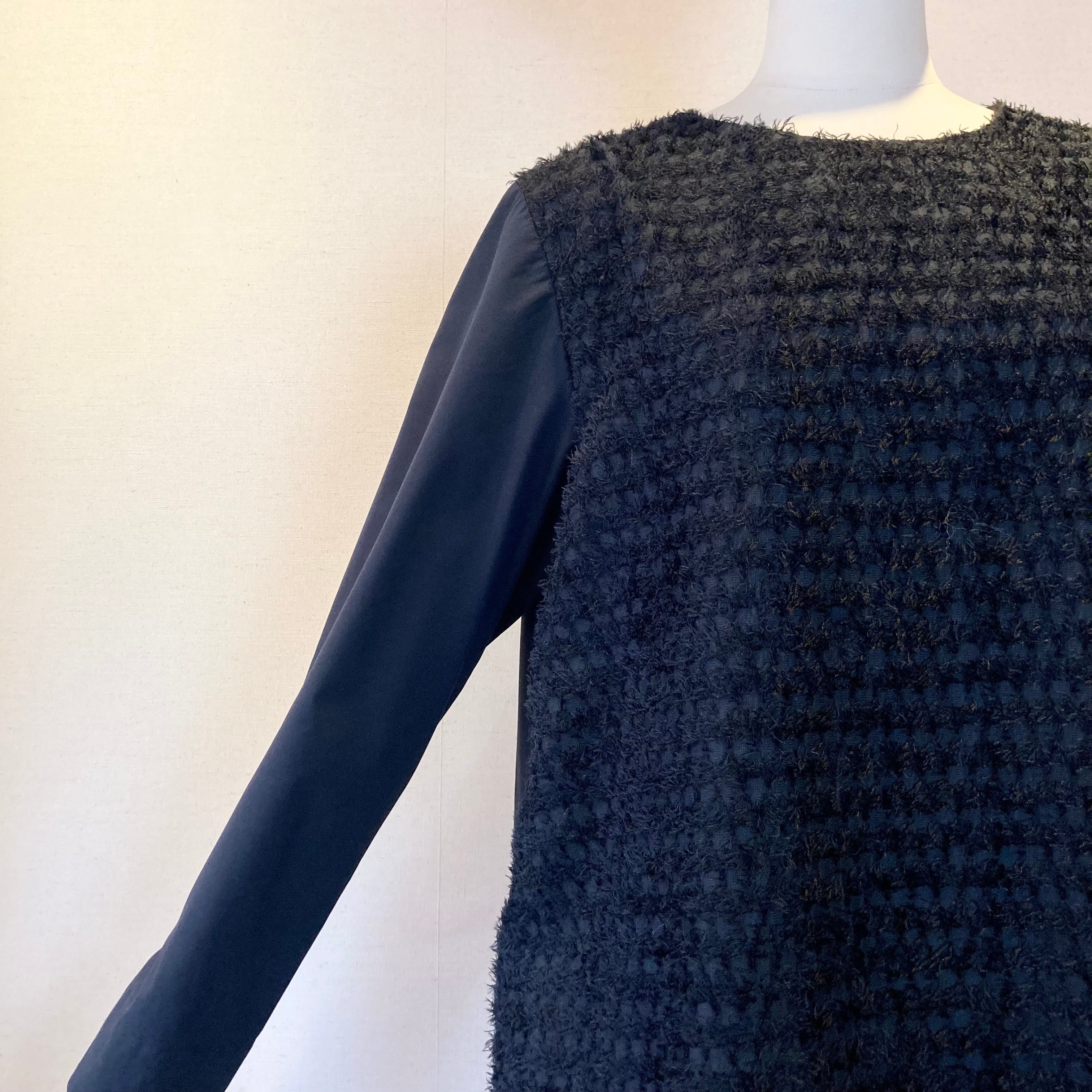 前身頃と袖口見返しをジャガード生地で切り替えたシンプルなAラインのワンピース…
