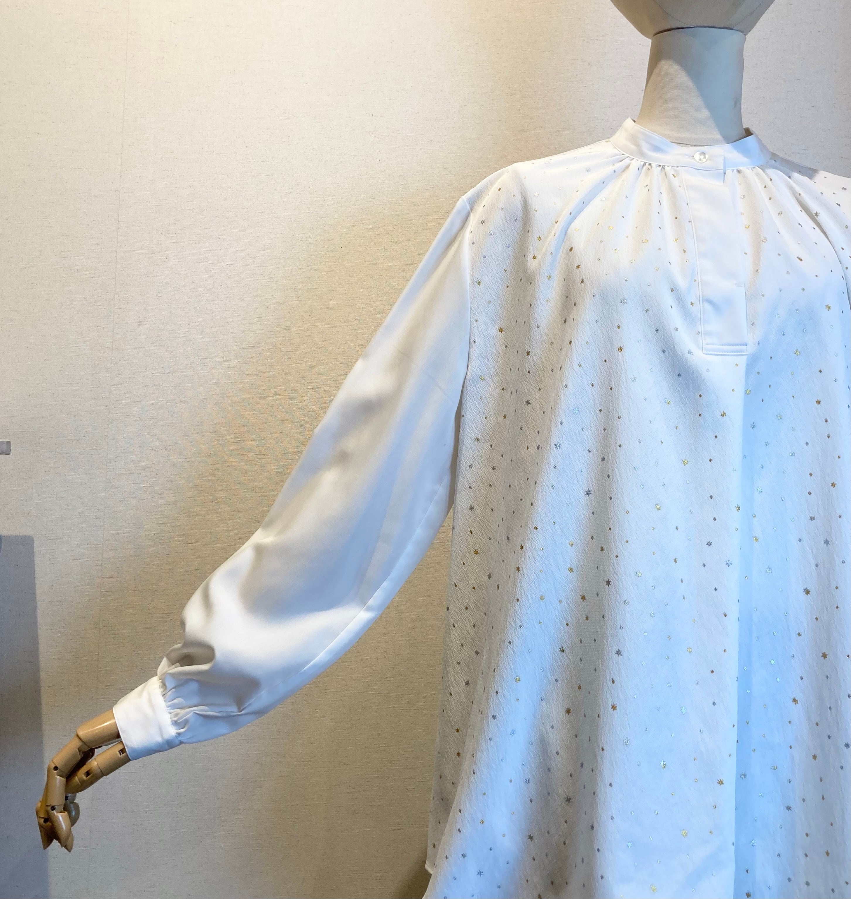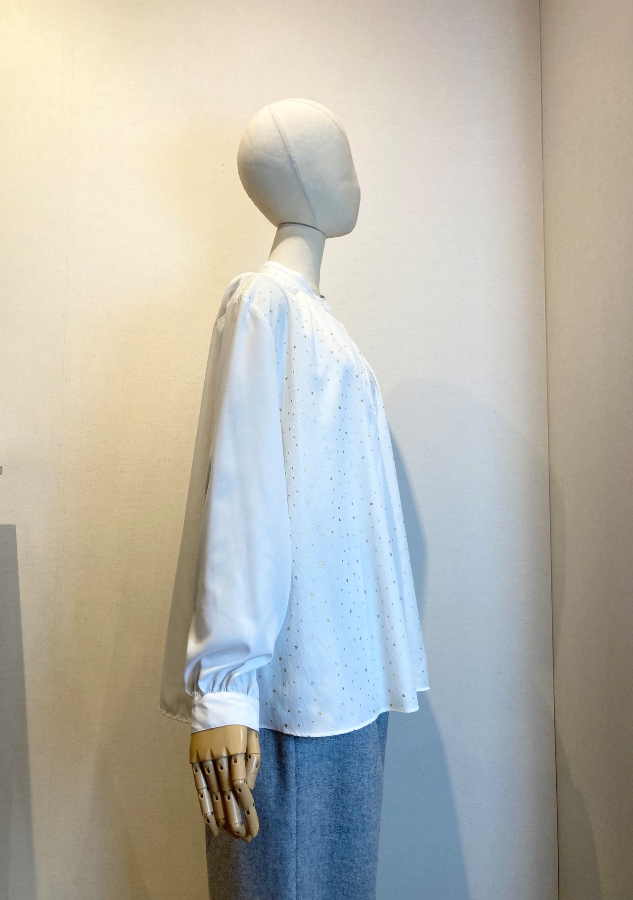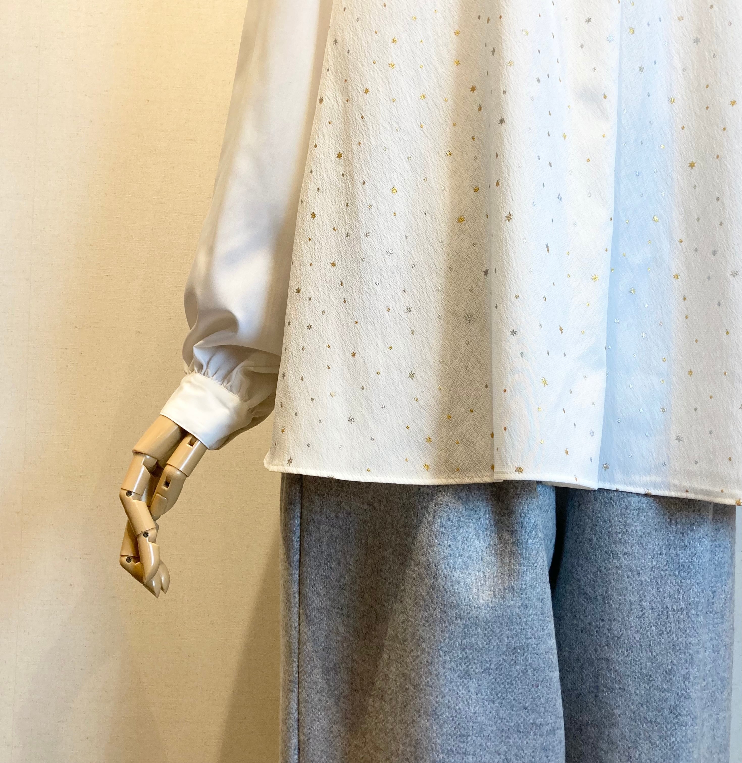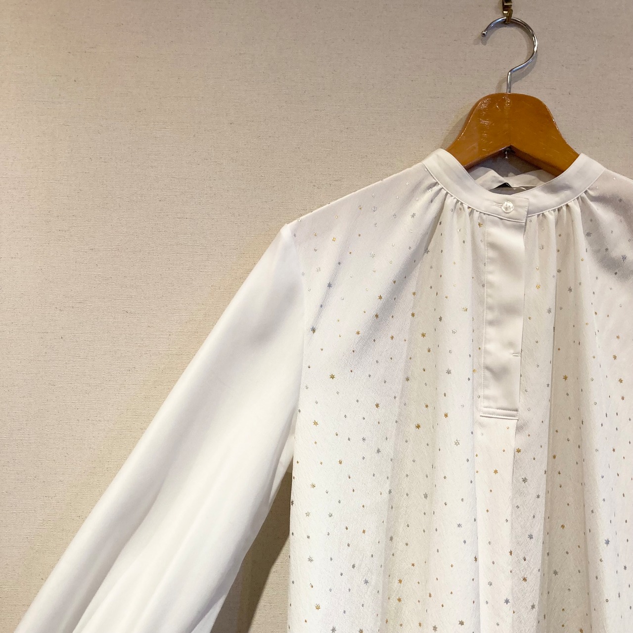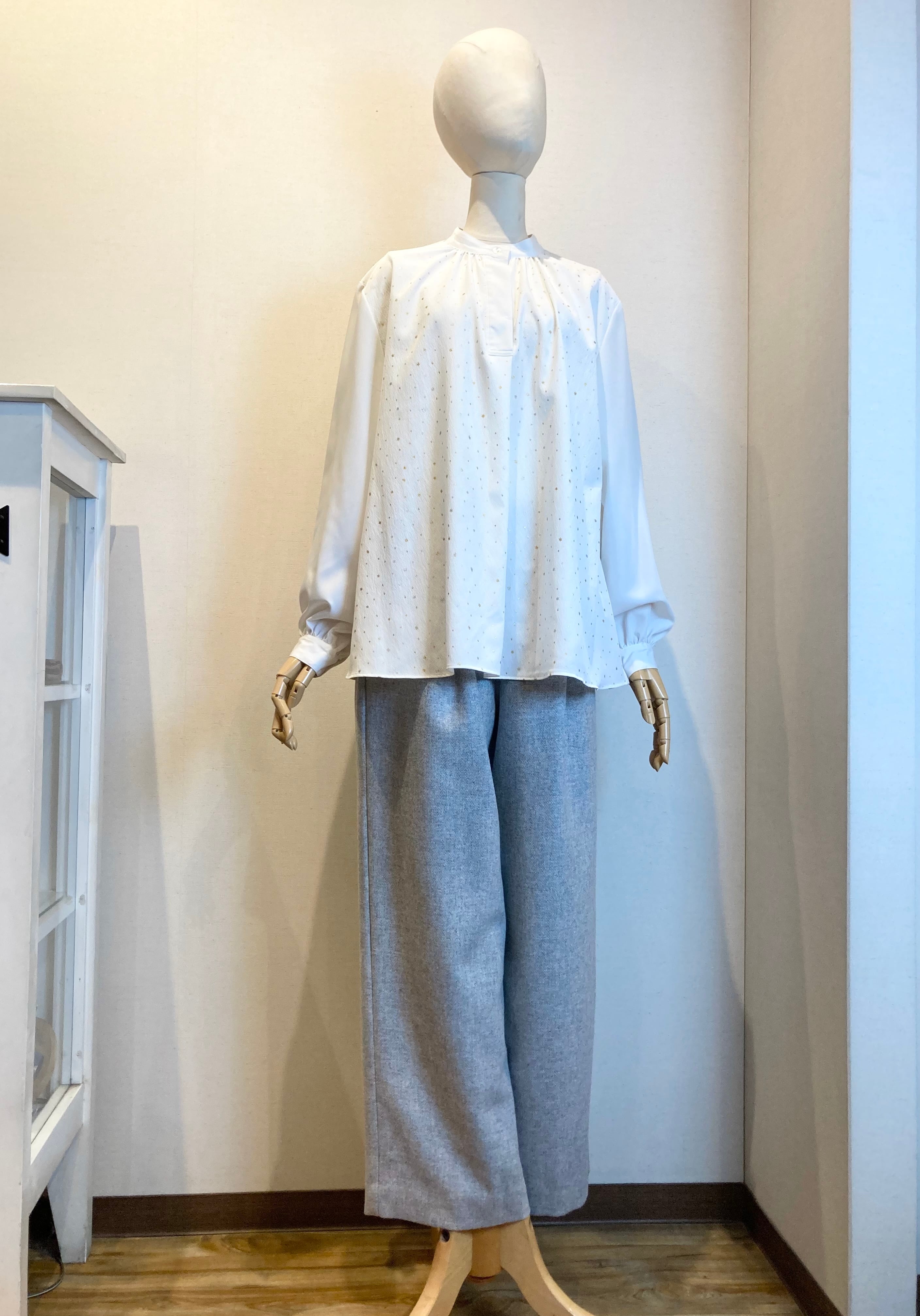 ベストやカーディガン、ジャケットのインに長い期間着こなしを楽しめるブラウスです