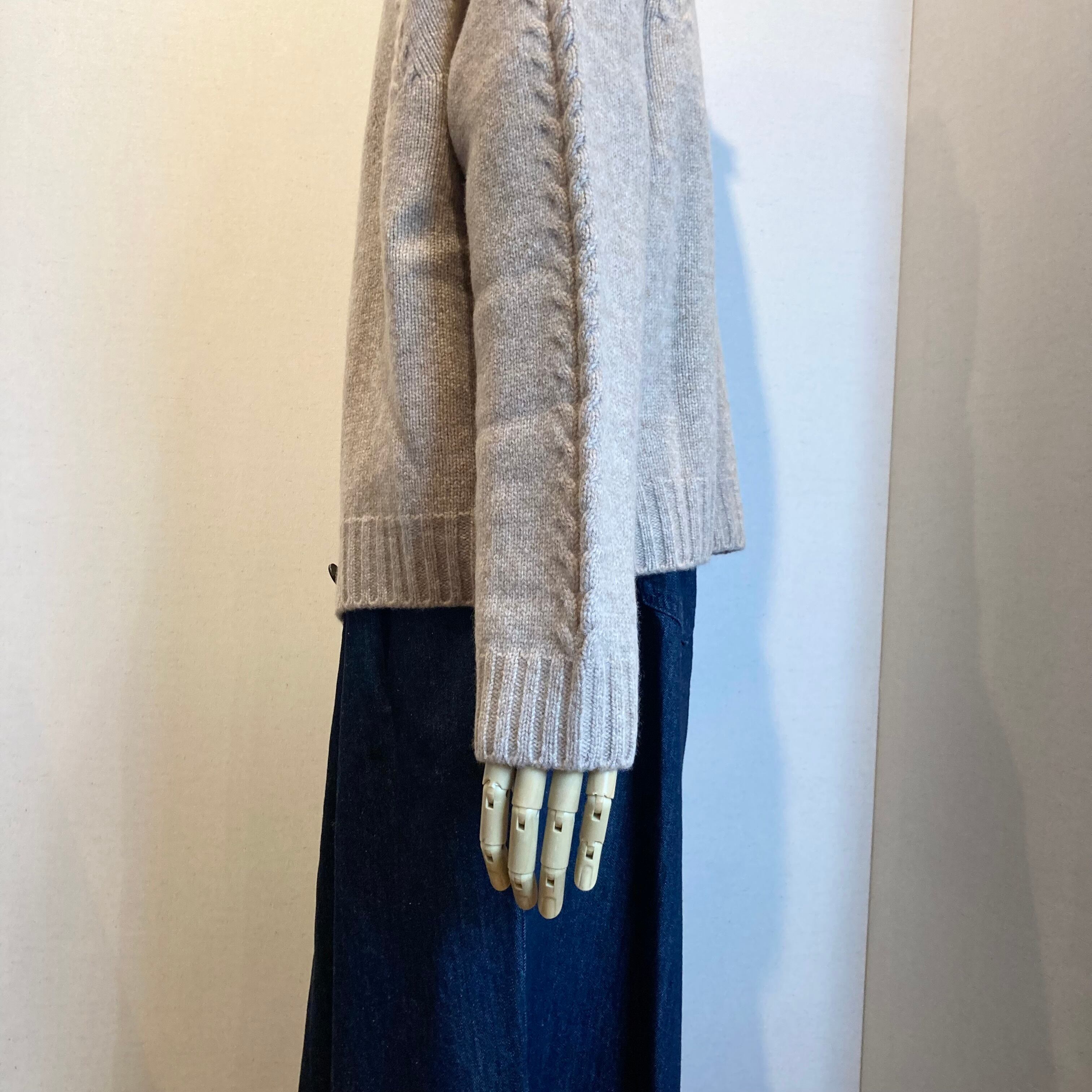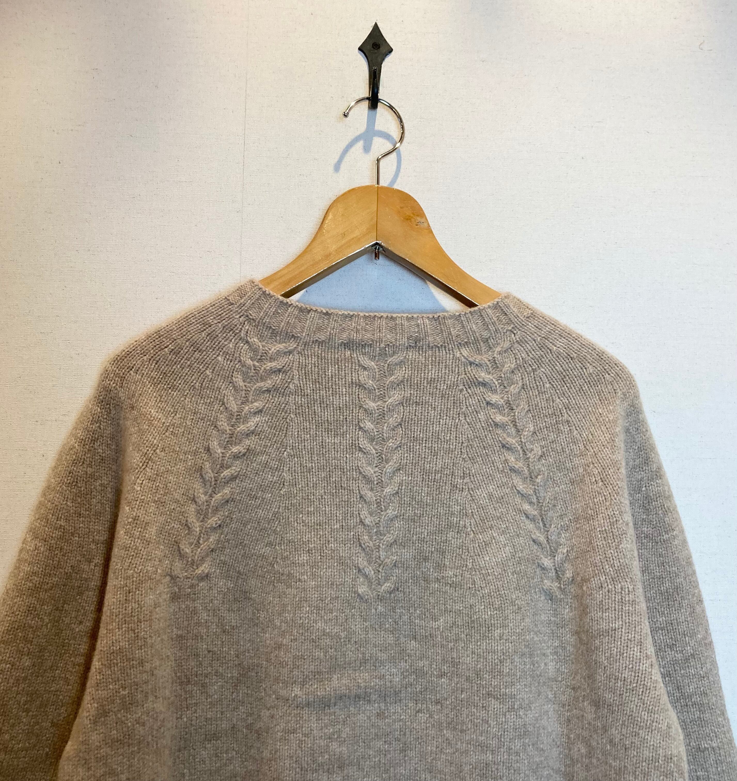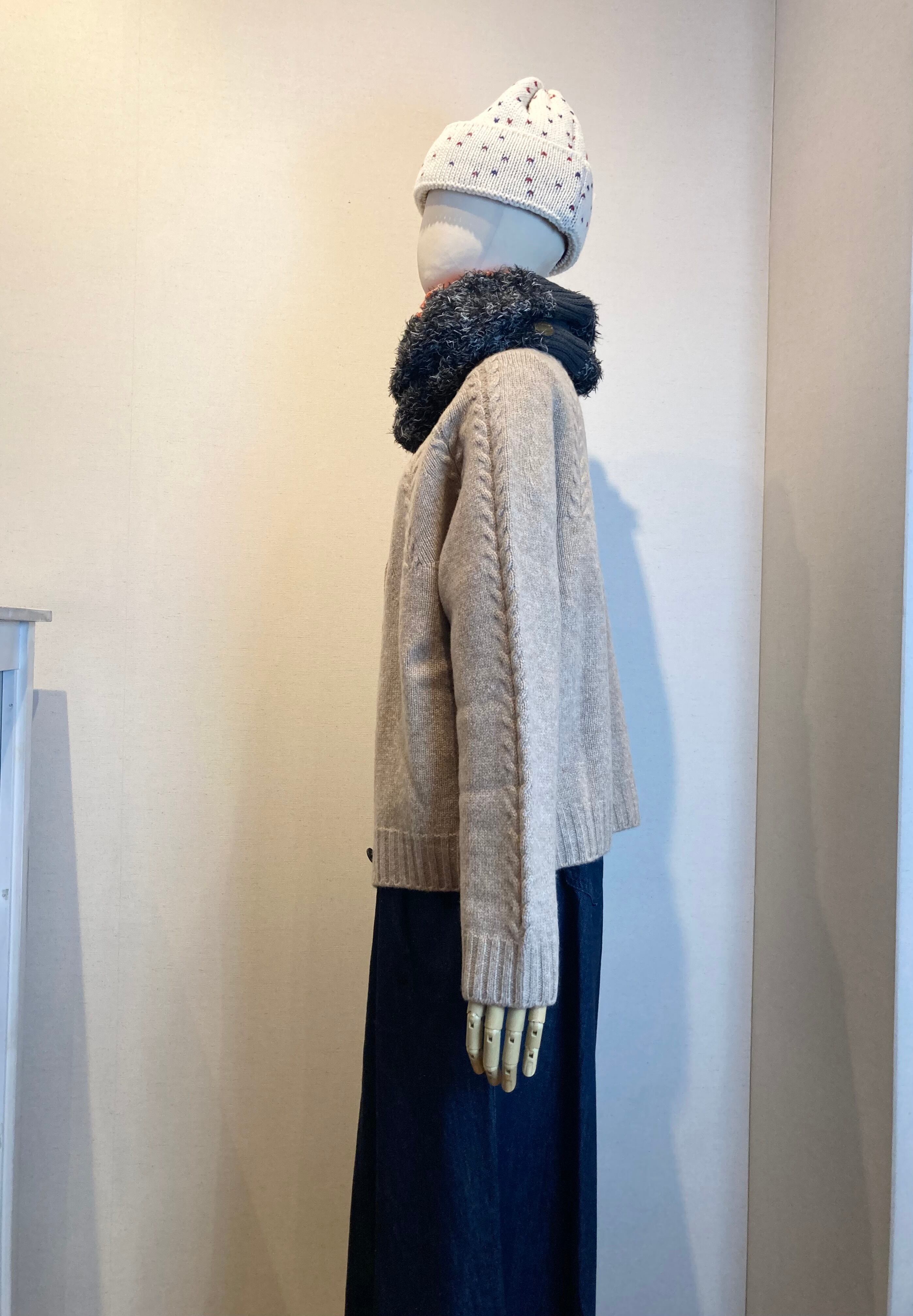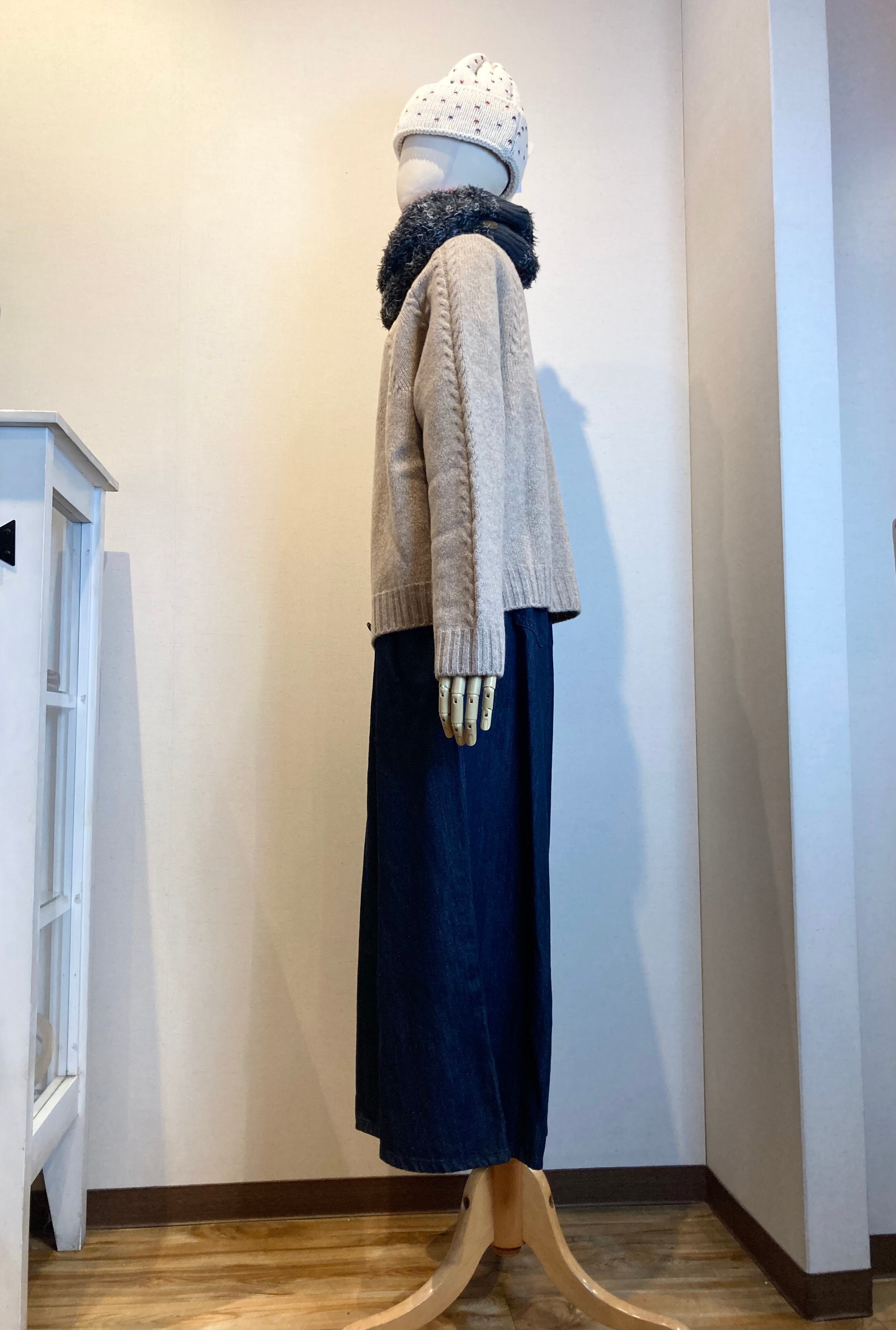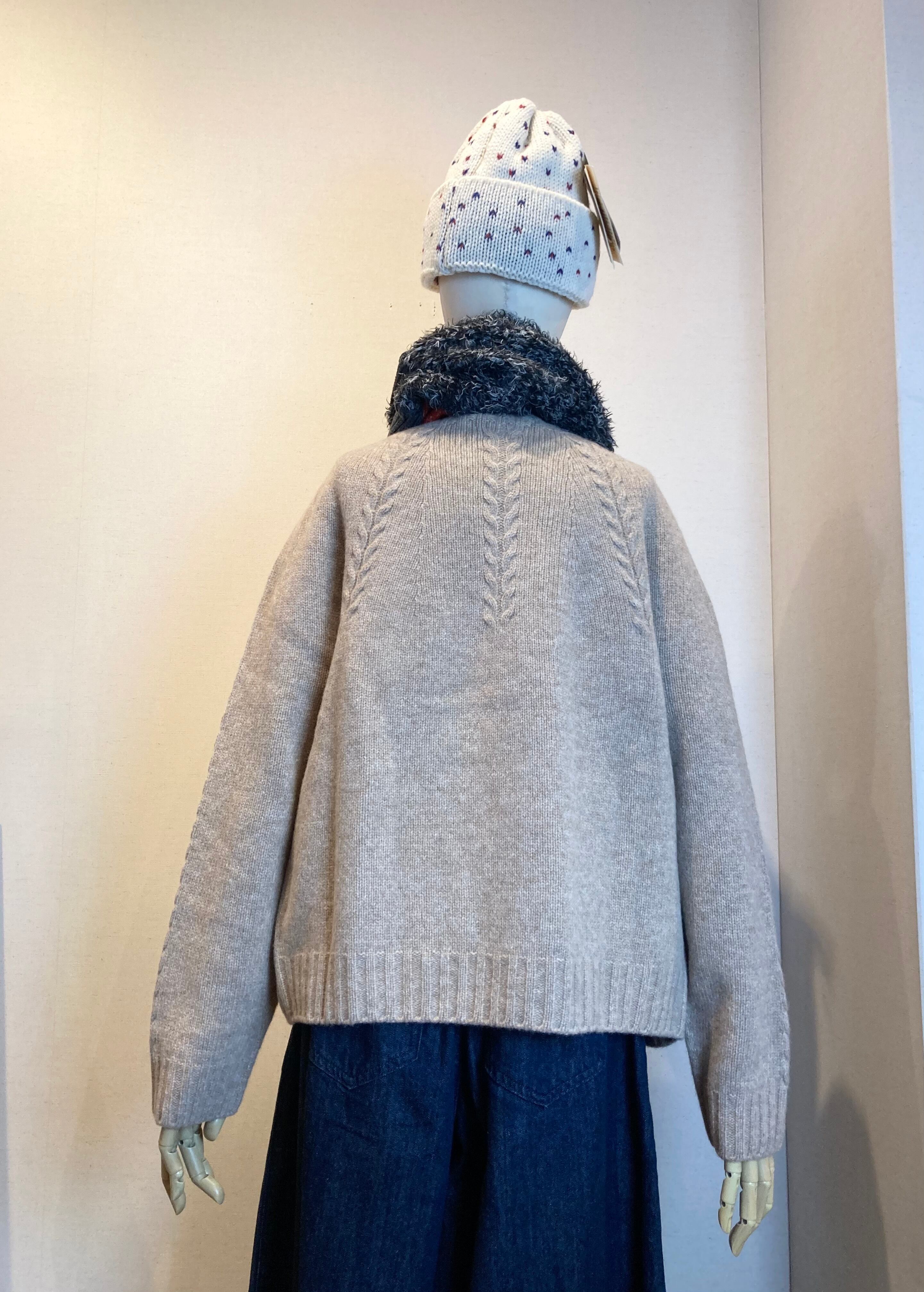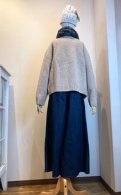 クルーネックの襟元から放射線状に施されたリーフ柄の編み地はワンポイントになっています