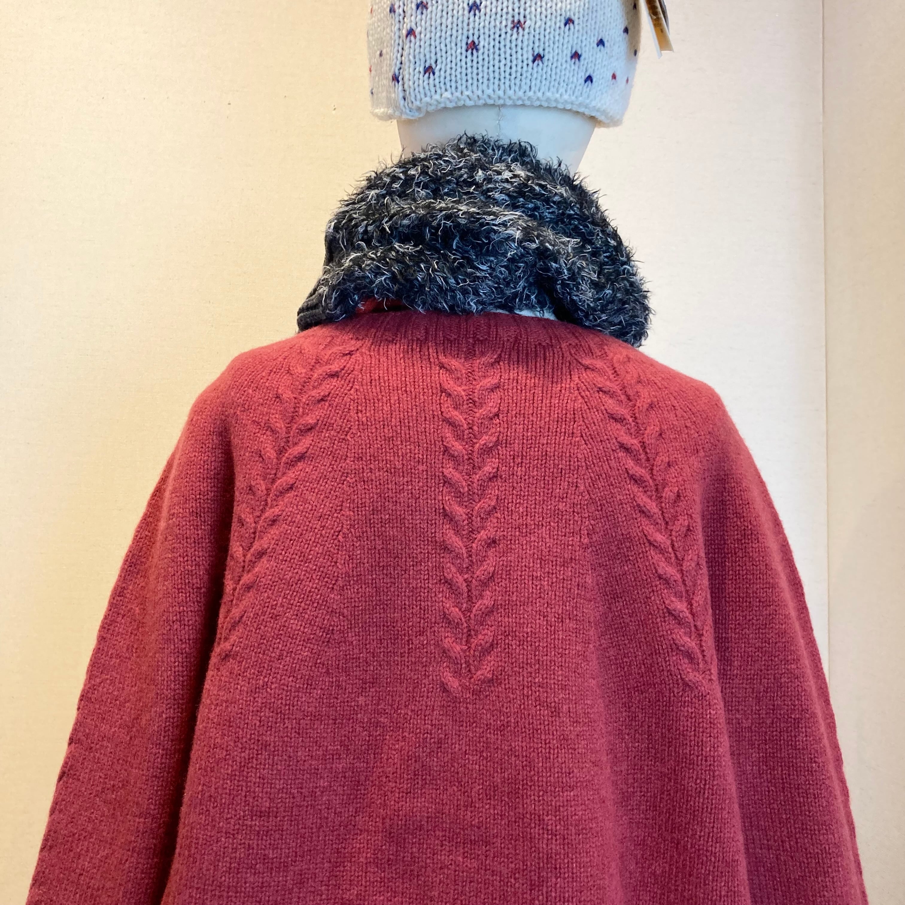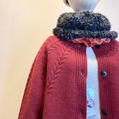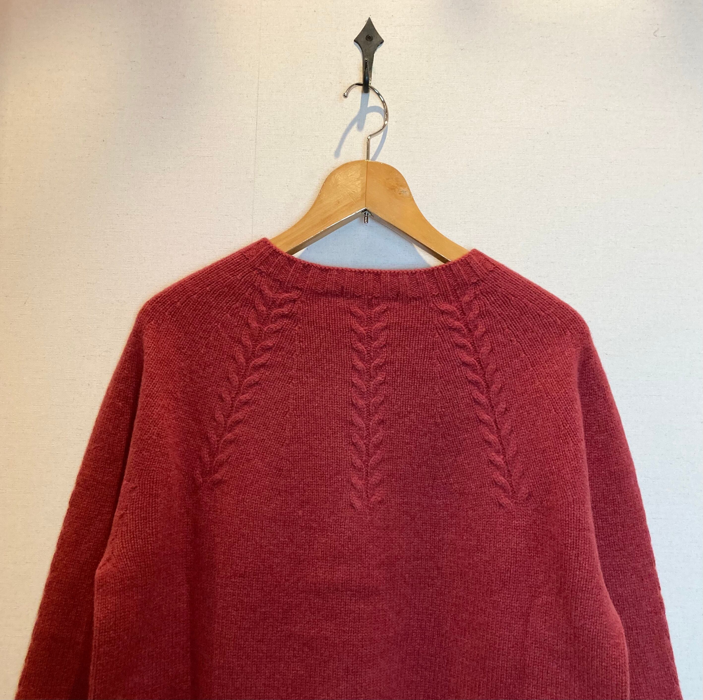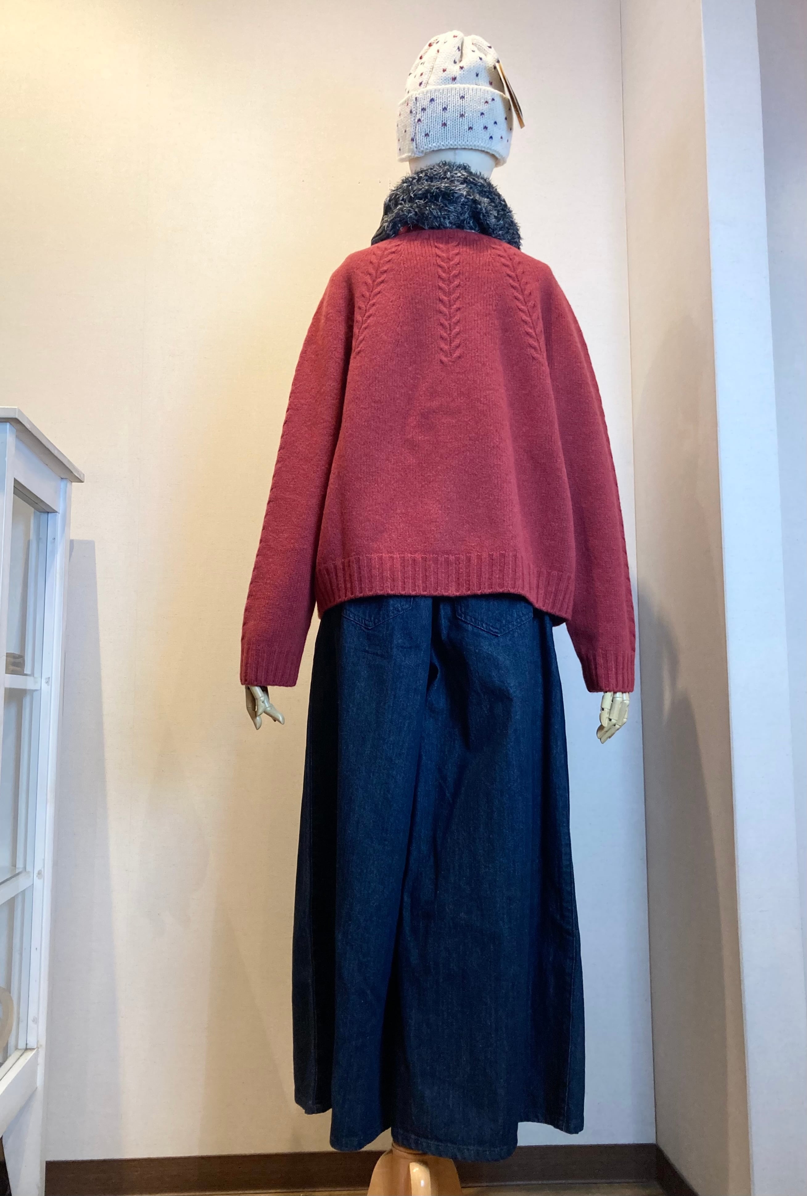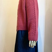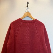 クルーネックの襟元から放射線状に施されたリーフ柄の編み地はワンポイントになっています