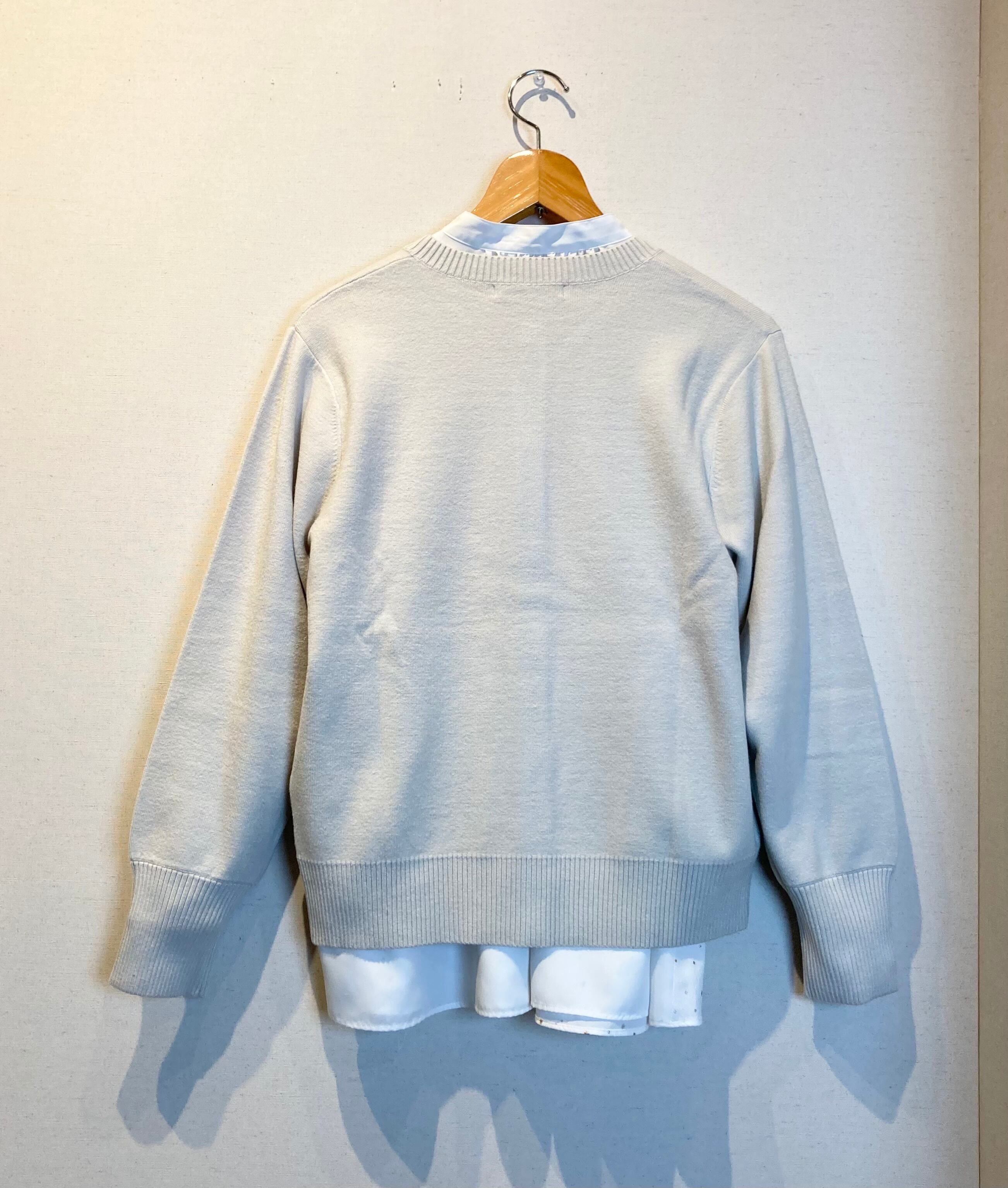 クルーネック、ドットリング釦、左右両サイドにポケットが付き使いやすい仕様です