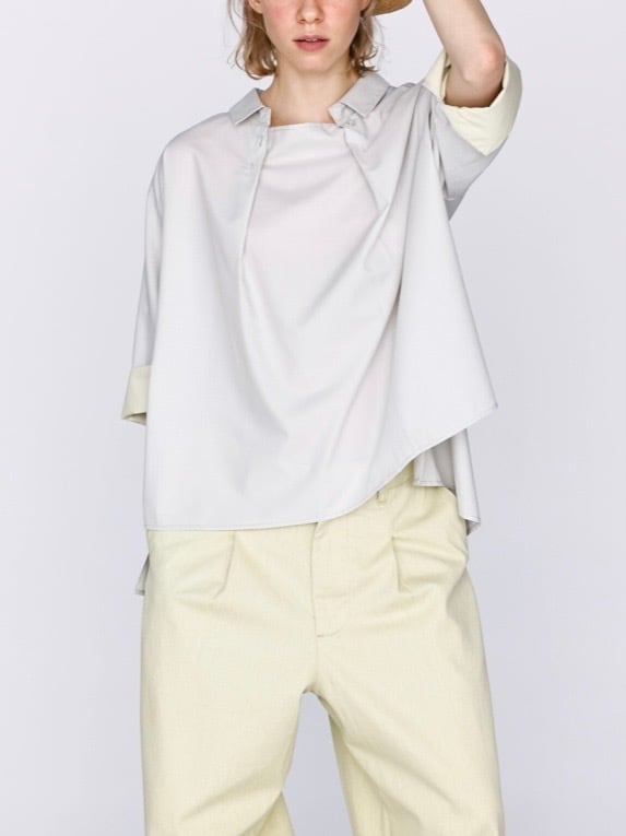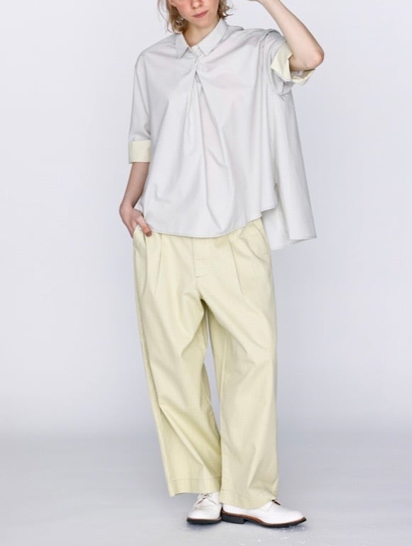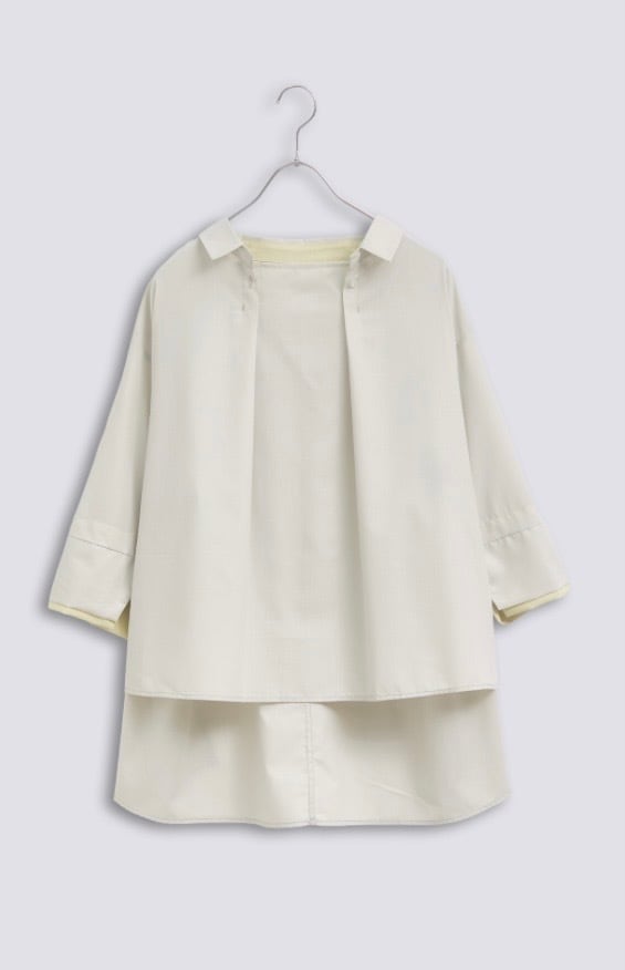 ボタンを開けるとザックリとしたオーバーシャツになり脇スリットで後ろ側裾が長いデザインです