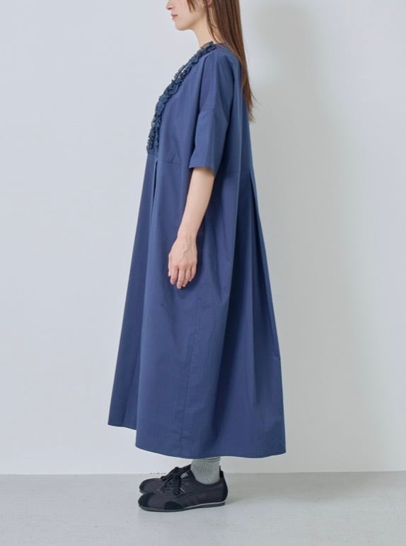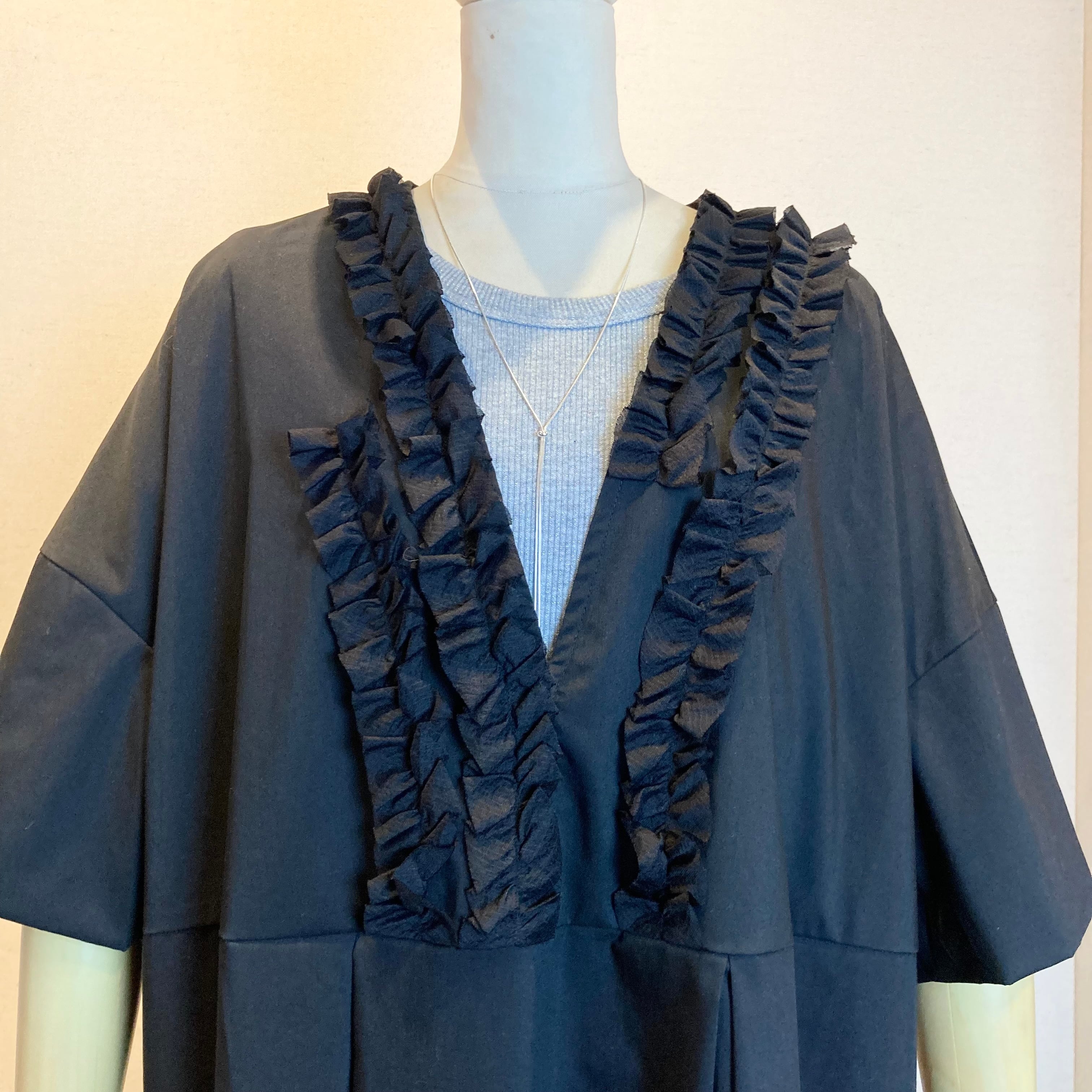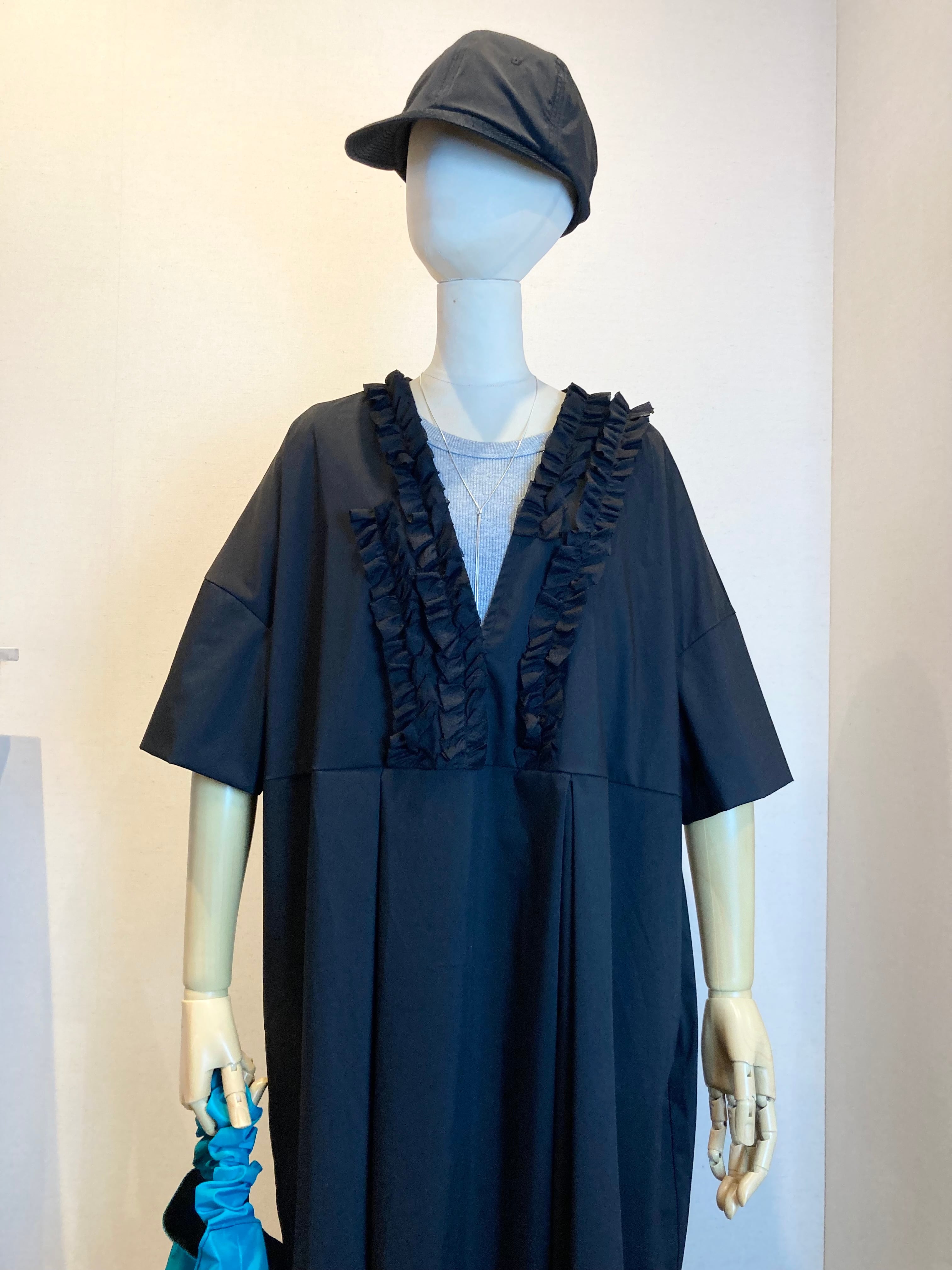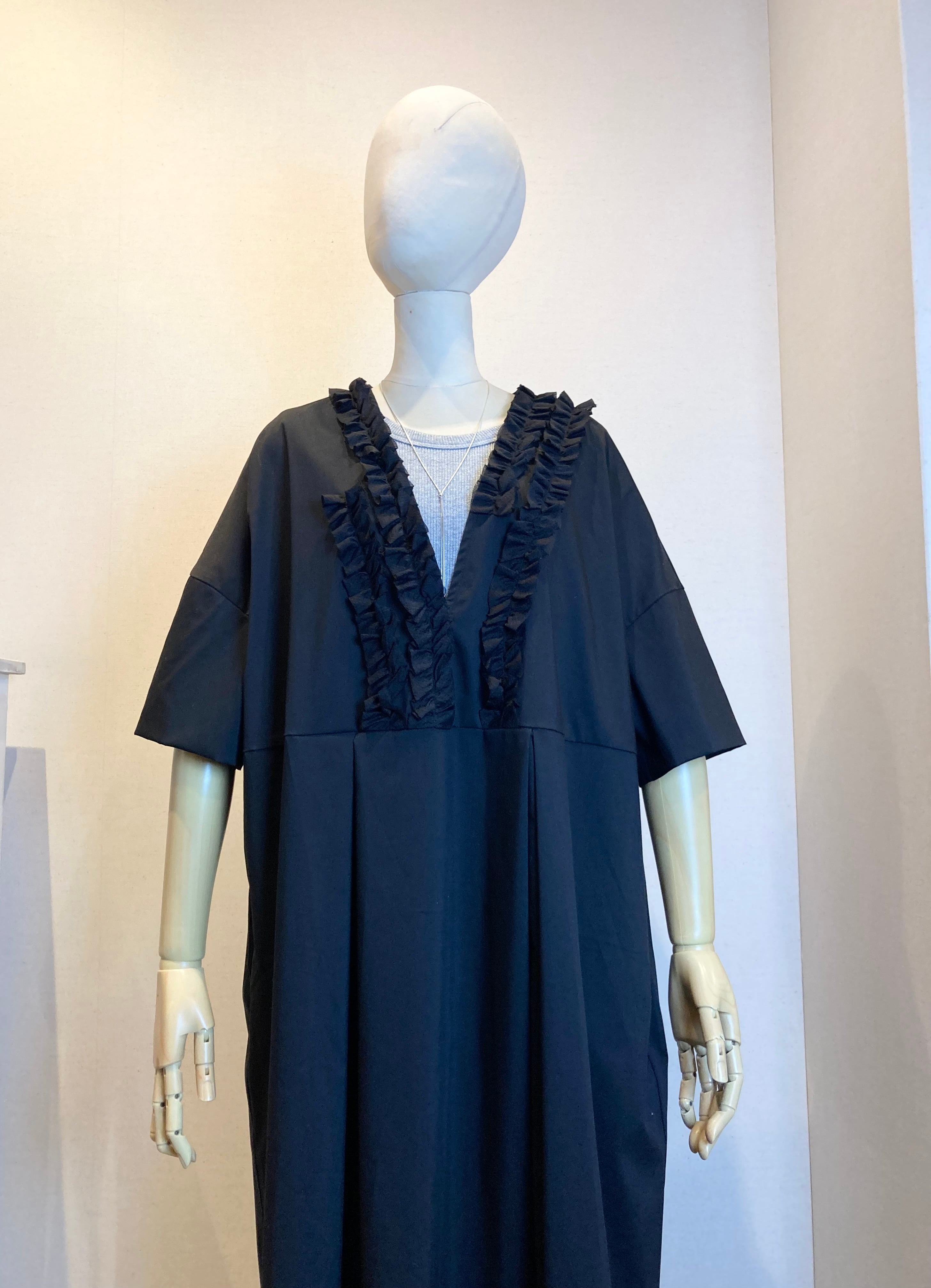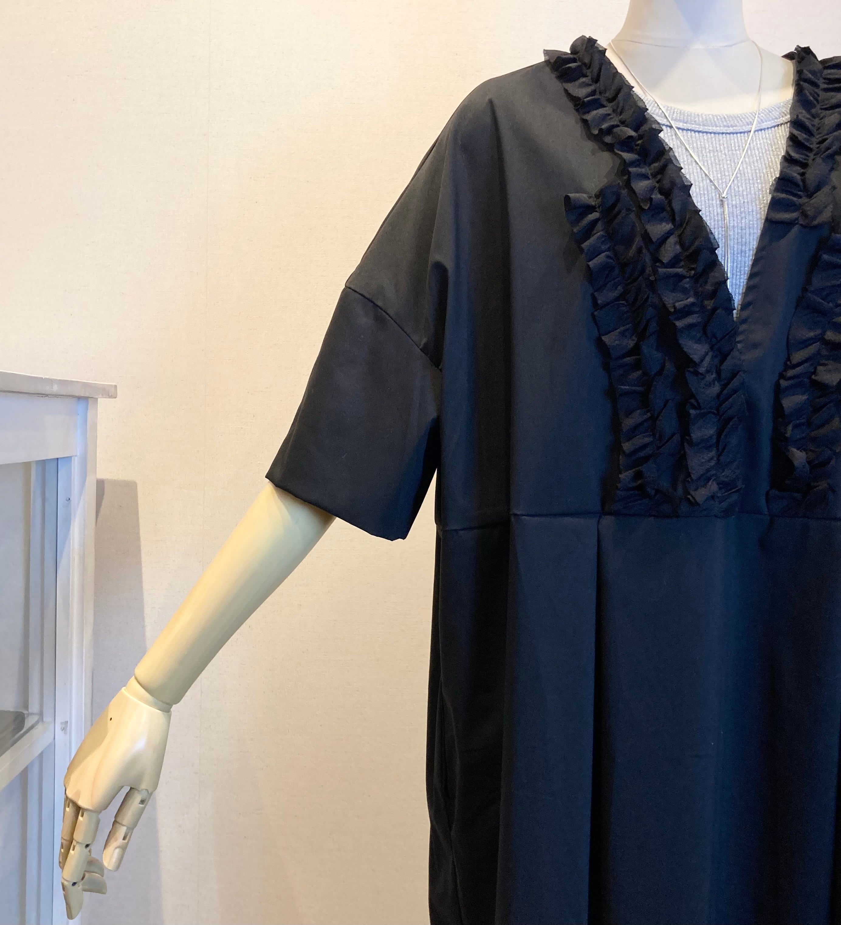 Vネックの首ぐりに沿って施したフリルデザインがポイントのワンピース…